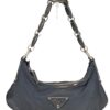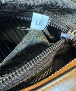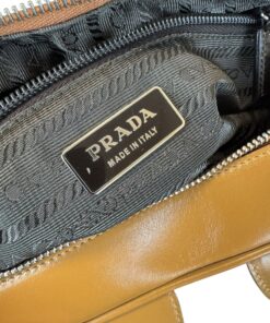 - Interno a vano unico, rivestito in tessuto marrone siglato Prada e corredato di una tasca con cerniera