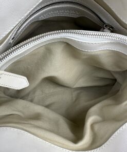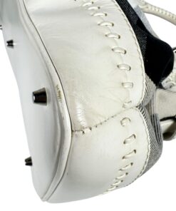 - Base e finiture in pelle bianca, con dettagli in pelle intrecciata