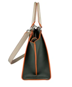 - Realizzata totalmente in pelle liscia grigia, con laterali e dettagli verde bosco
