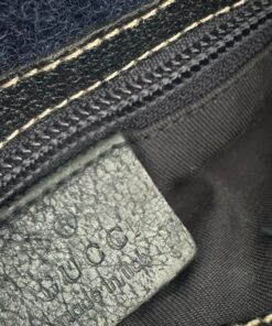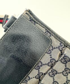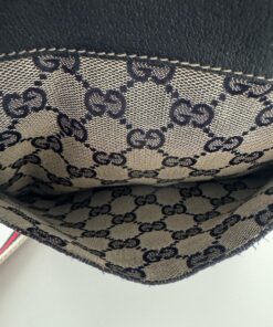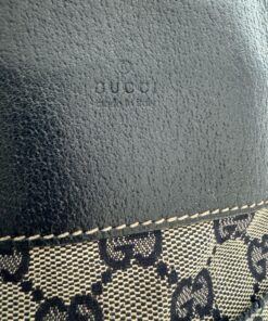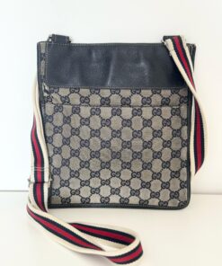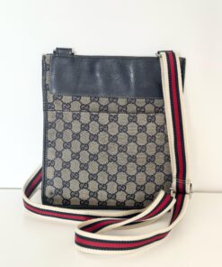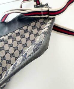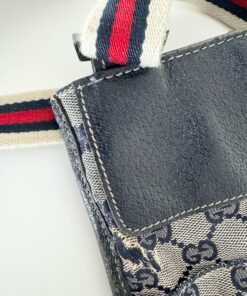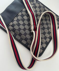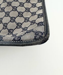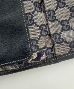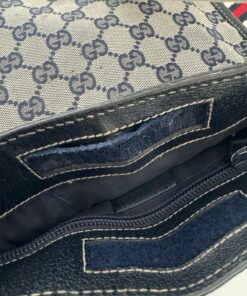 Borsa Gucci GG piatta, in tela GG blu e beige e con finiture in pelle blu scuro, da portare a tracolla.