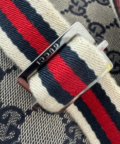 La tracolla è regolabile ed è realizzata nel motivo Web blu rosso e beige.