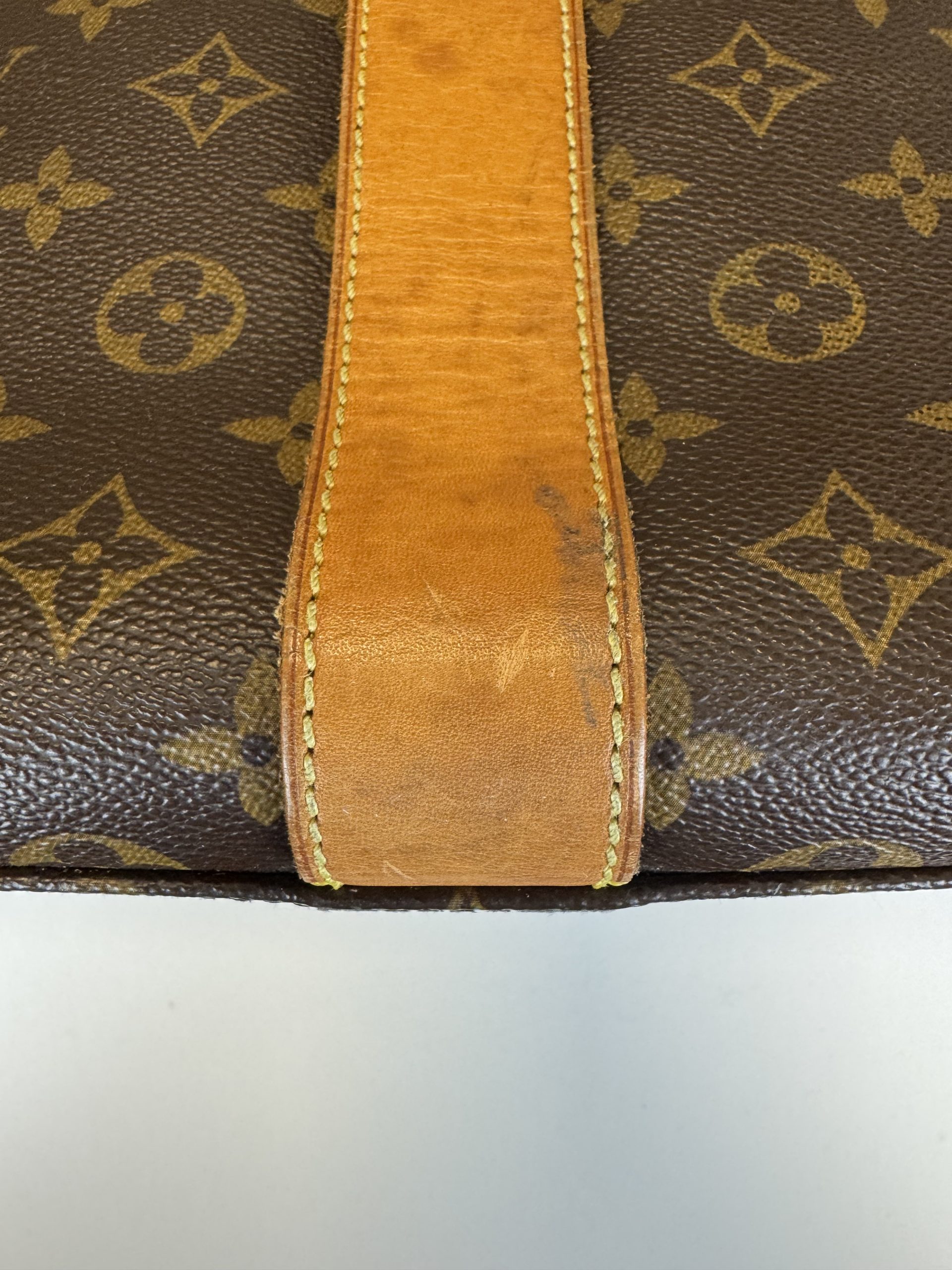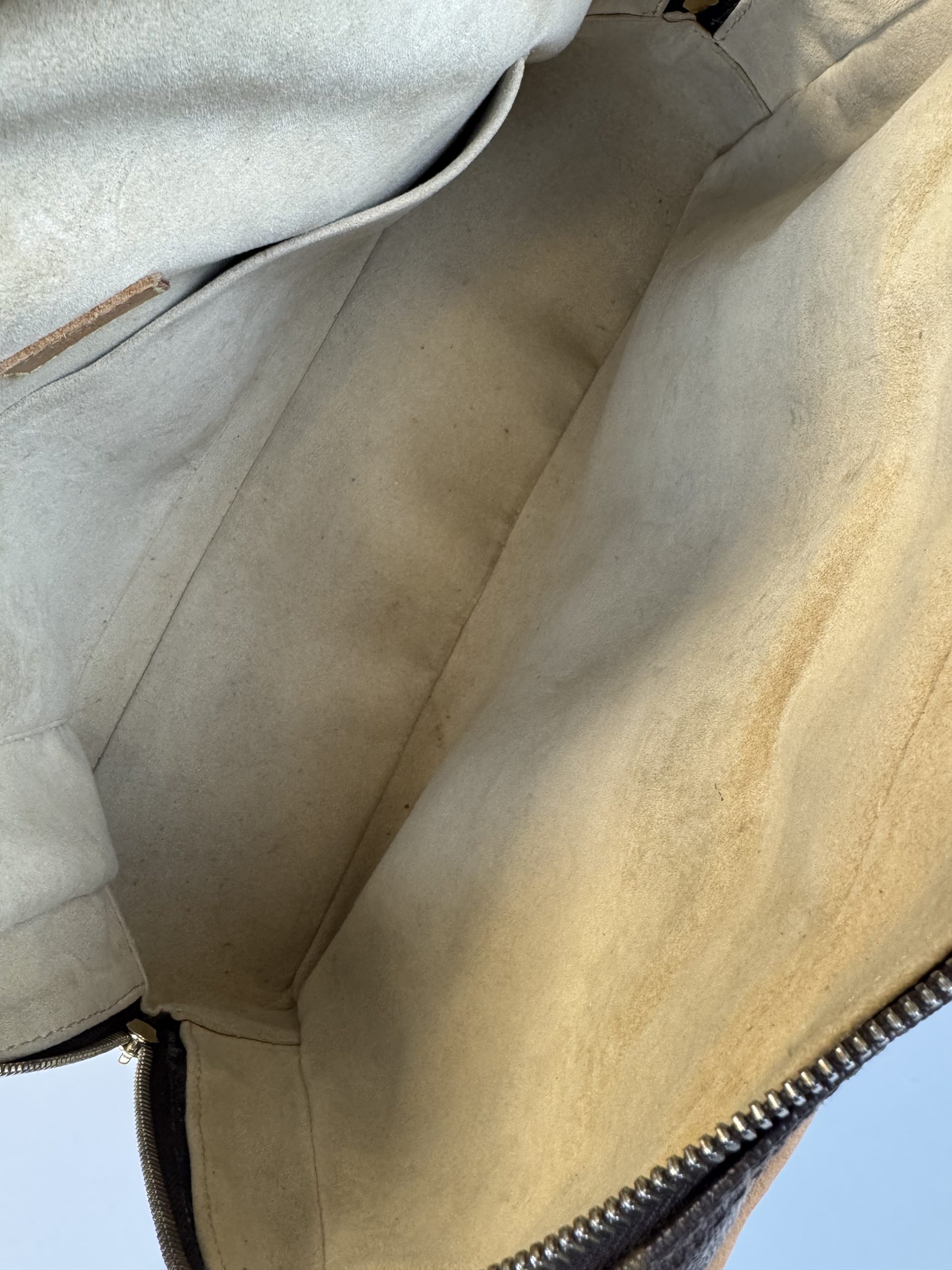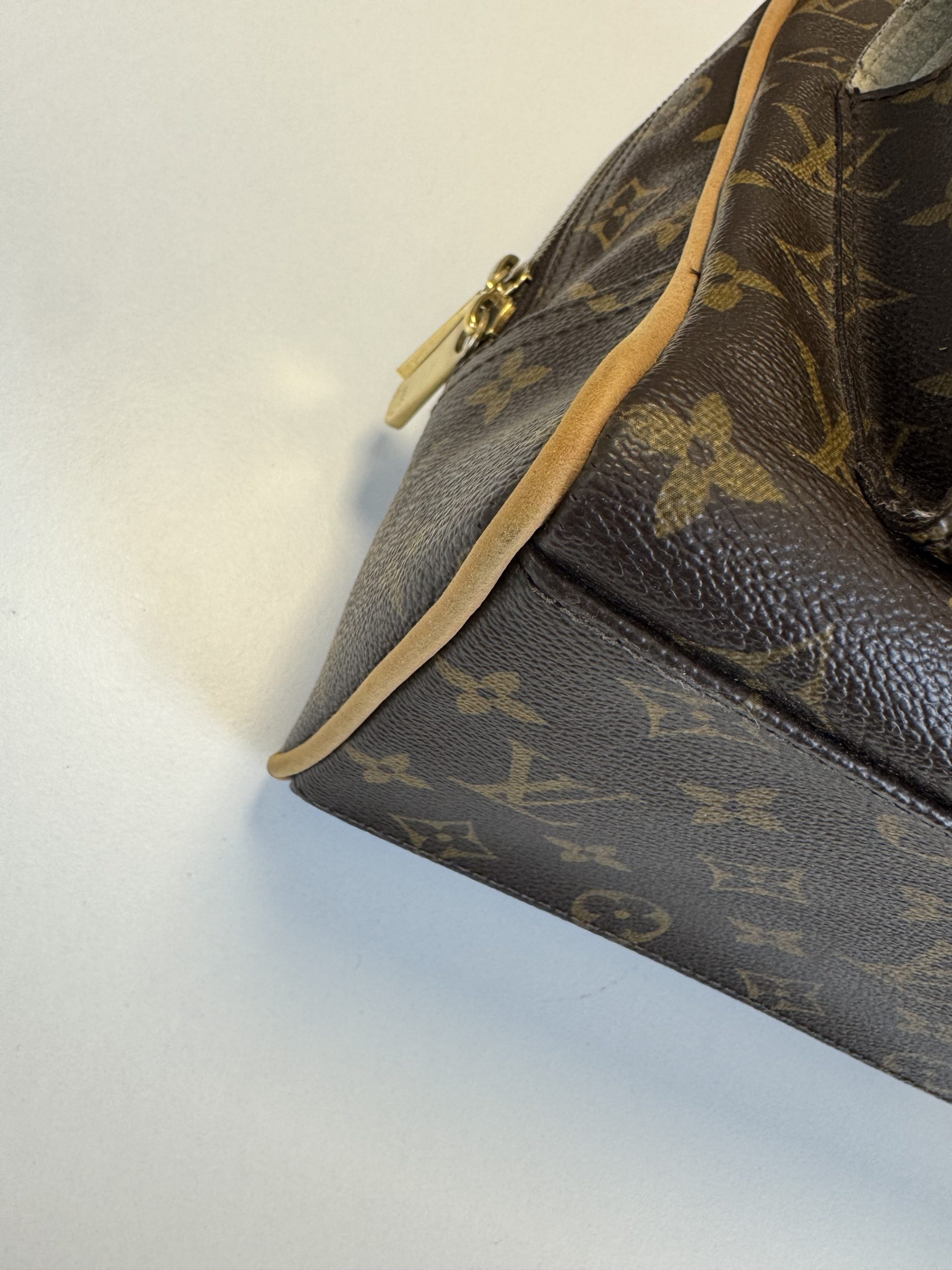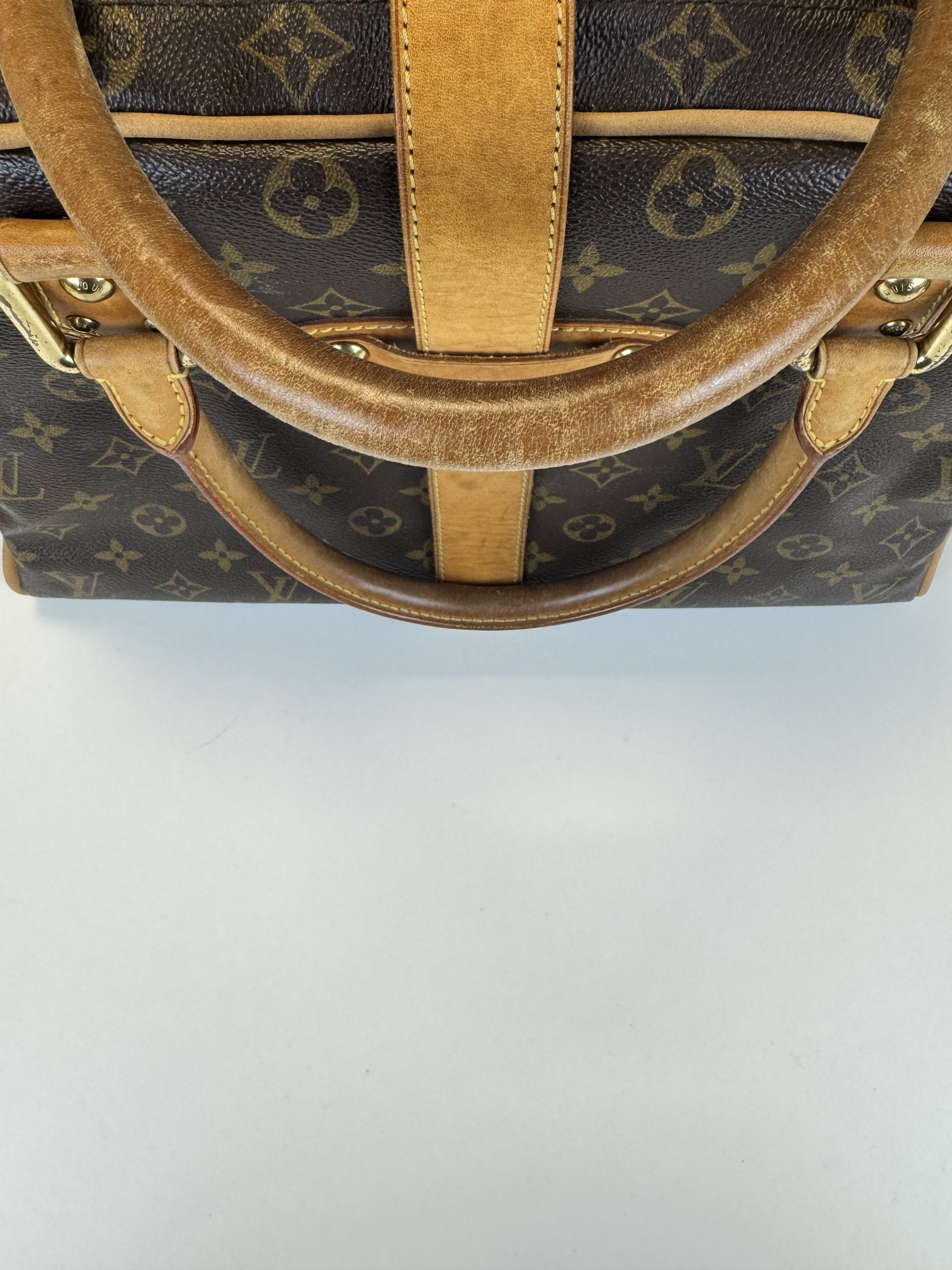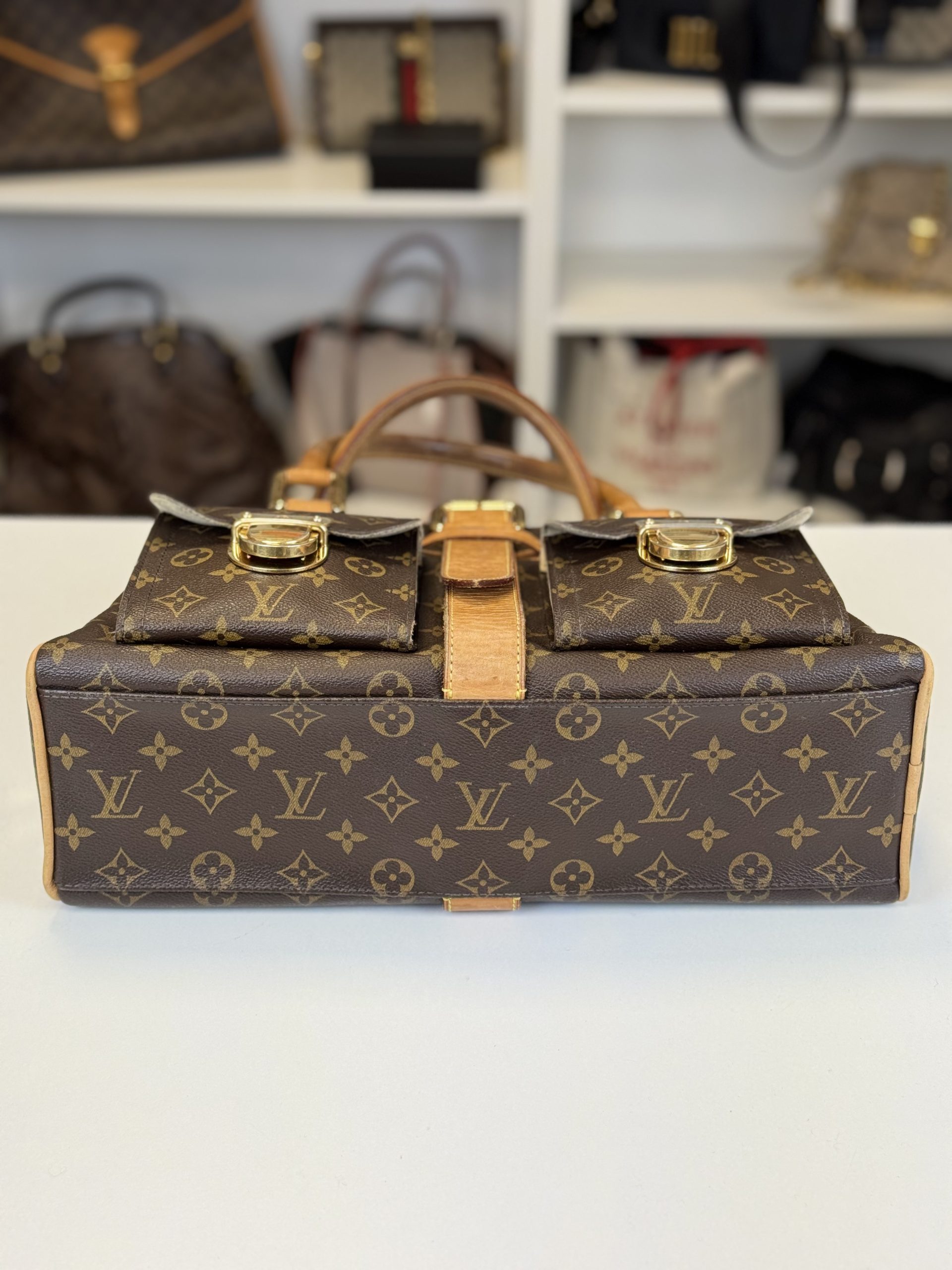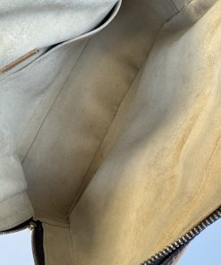Design moderno e strutturato. Realizzata in tela monogram con finiture e doppi manici in vacchetta. Si distingue per le due tasche frontali con chiusura a pressione push-lock in metallo dorato. Doppia cerniera superiore, sormontata da una cinghia con fibbia che attraversa il centro della borsa. Gli interni sono in morbida Alcantara beige.