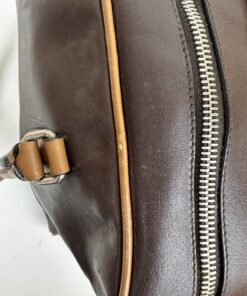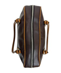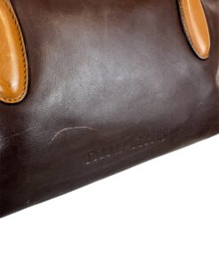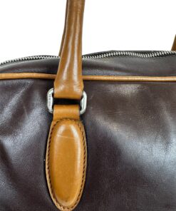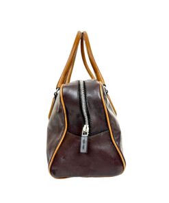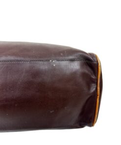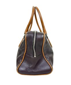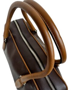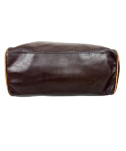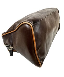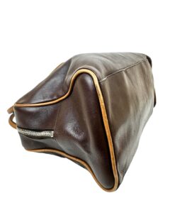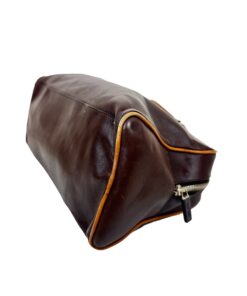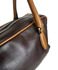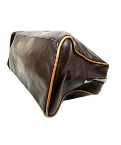 - Realizzata interamente in pelle marrone scuro, con finiture in pelle color cognac