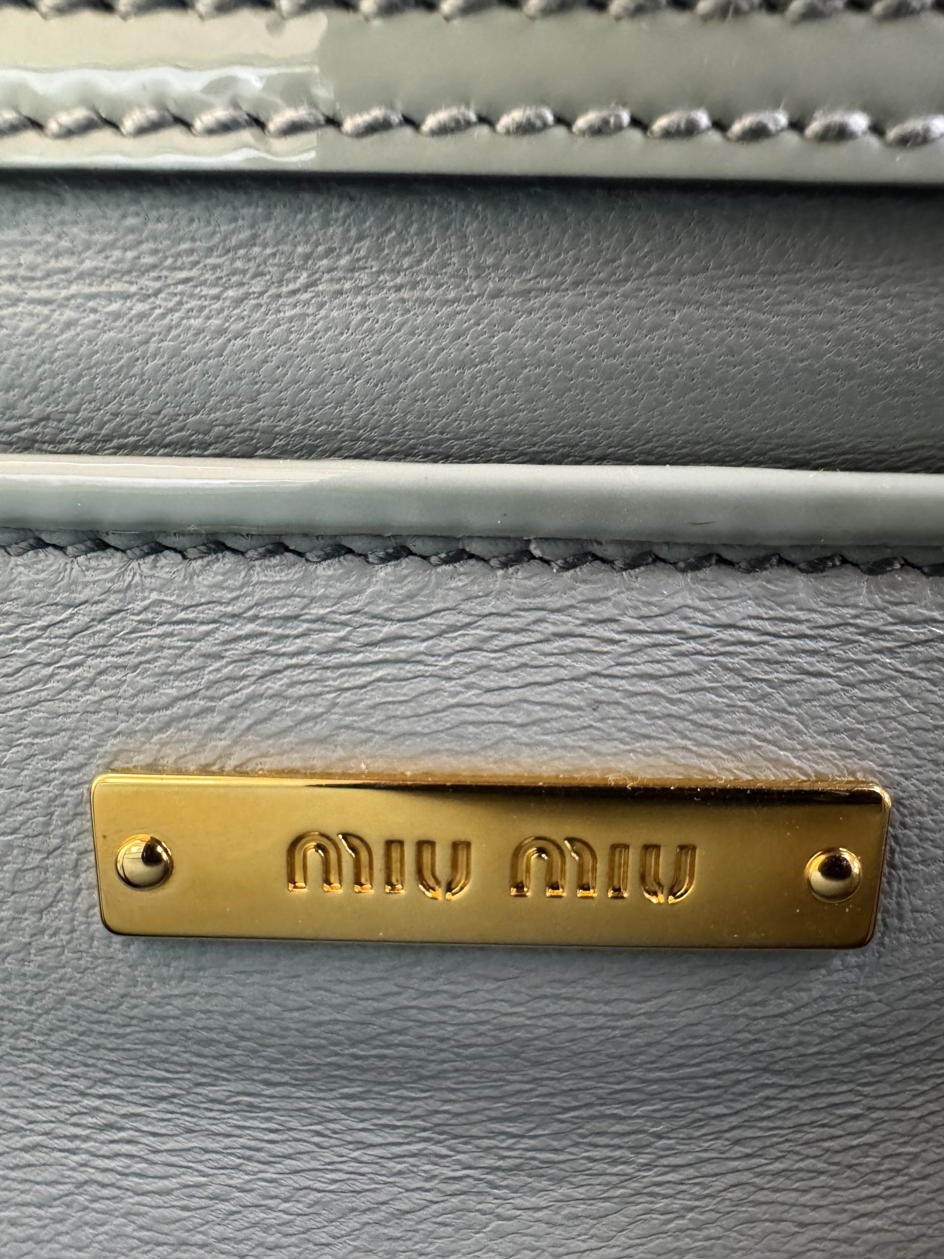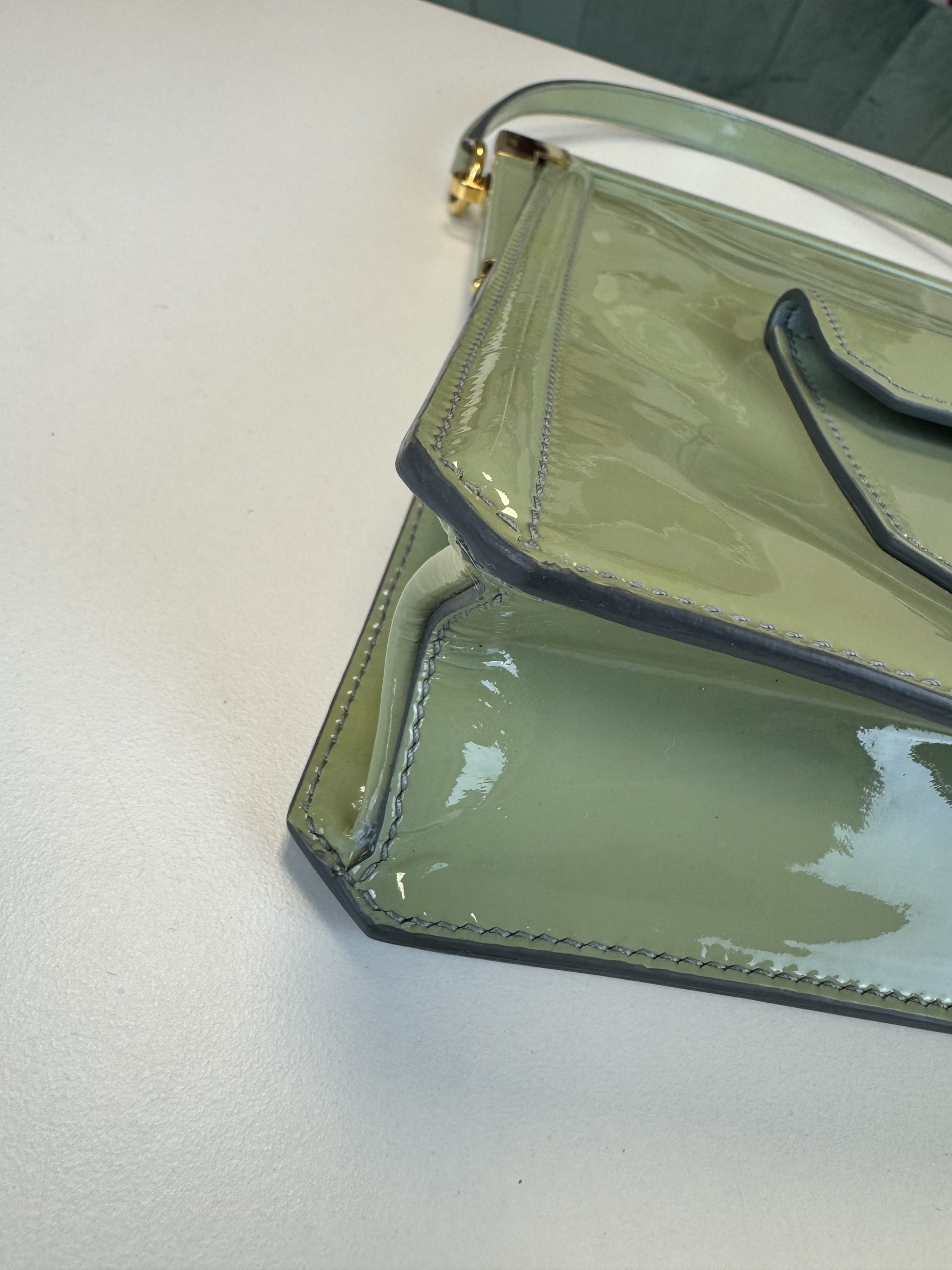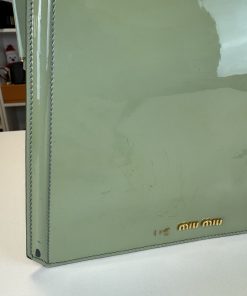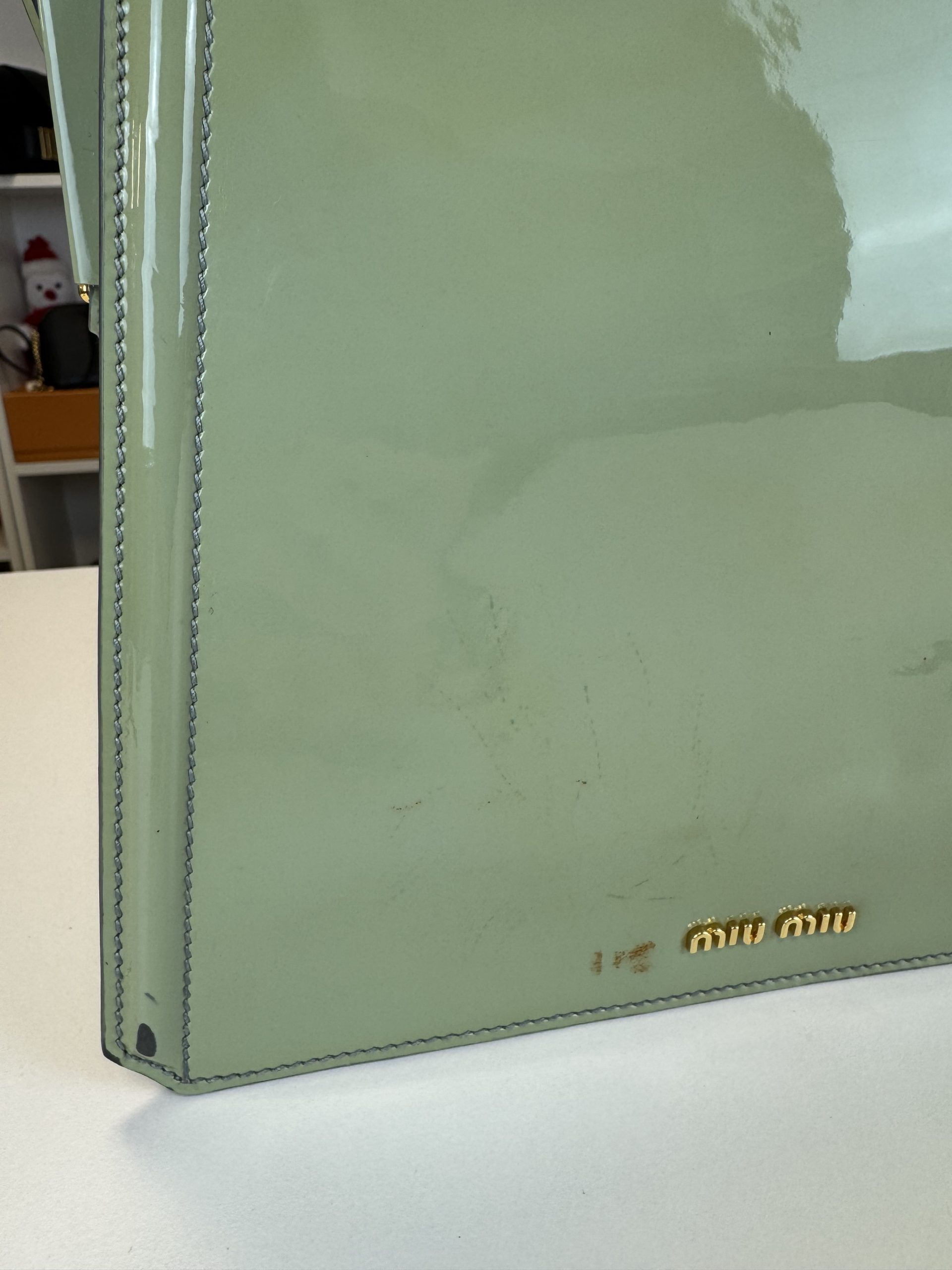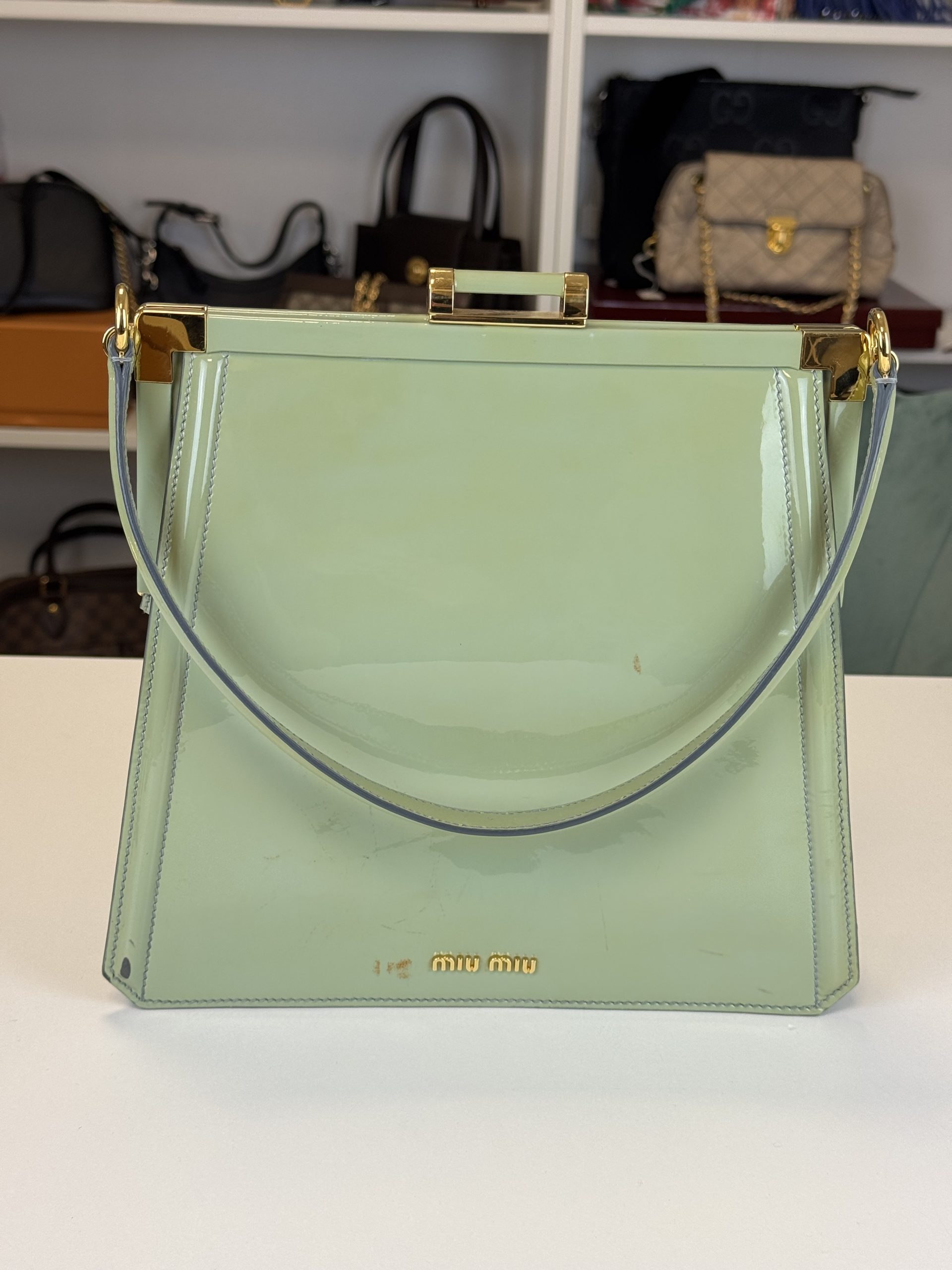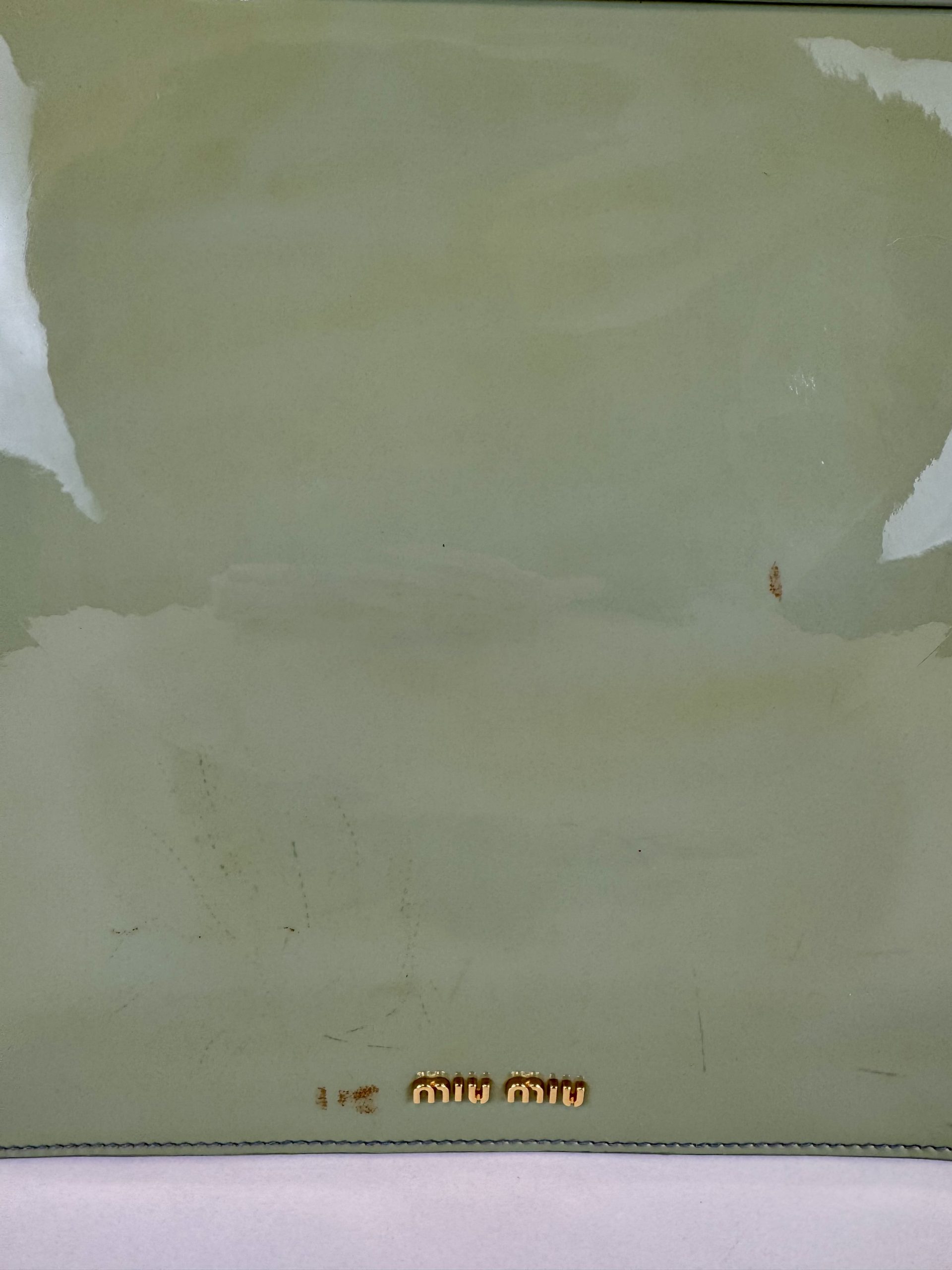 Deliziosa borsa Miu Miu in pelle verniciata dal color verde menta pastello.