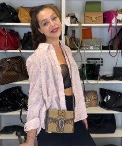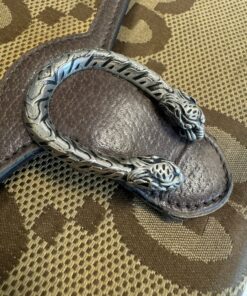 Presenta una patta frontale, arricchita dalla chiusura a doppia testa di tigre caratteristica del modello Dionysus di Gucci.
