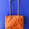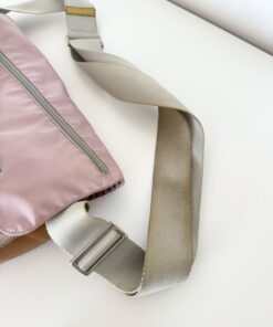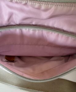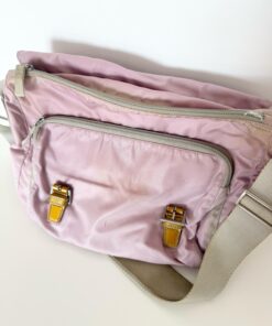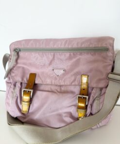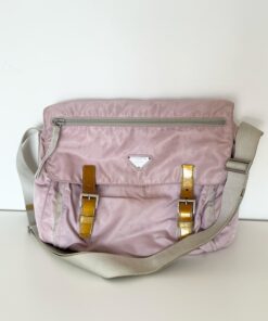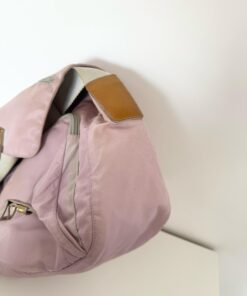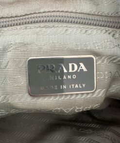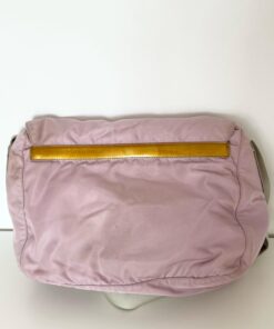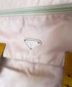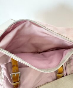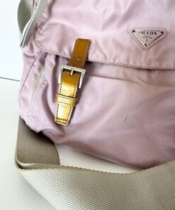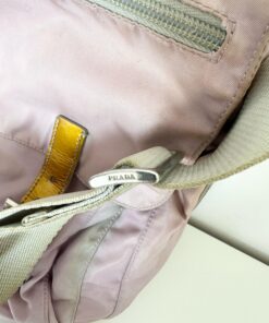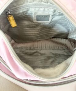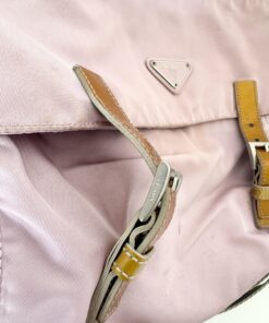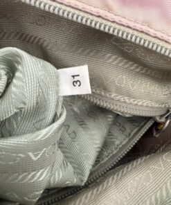 È presente il logo triangolare Prada in rosa, sulla patta esterna.