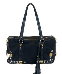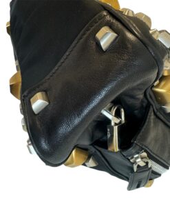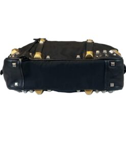 Questa borsa Prada borchiata in nylon e pelle nera è l’accessorio perfetto per chi cerca un mix di lusso, stile contemporaneo e carattere deciso.