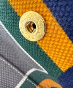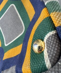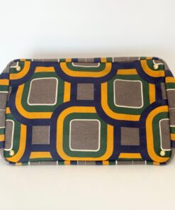 Bellissima e molto capiente, è realizzata in tela multicolore blu, verde, grigio e gialla con fantasia geometrica.