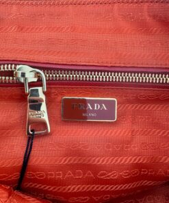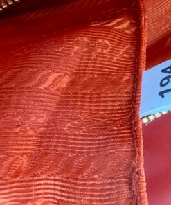 Internamente è realizzata in tessuto arancione firmato Prada ed è provvista di una tasca a cerniera e di una tasca piatta.