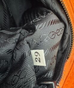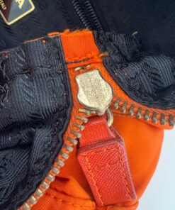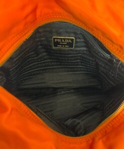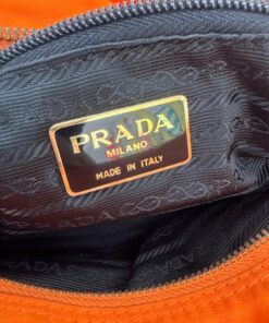 Sul lato frontale è presente il tipico logo Prada, su triangolo in metallo smaltato arancione.