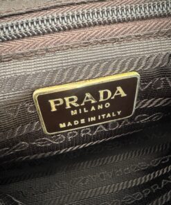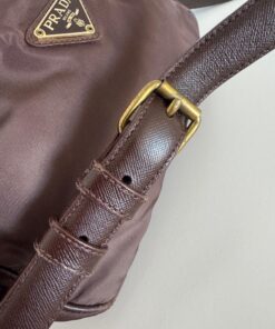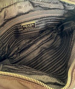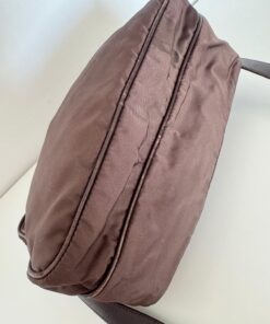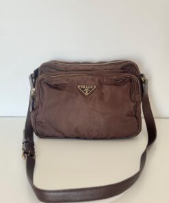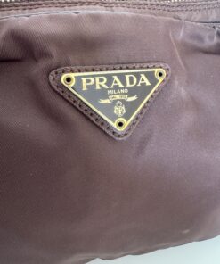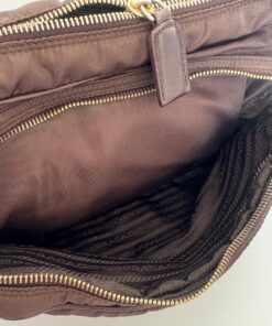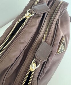 Borsa Prada in nylon marrone, con tre tasche a cerniera e manico in pelle.
