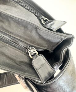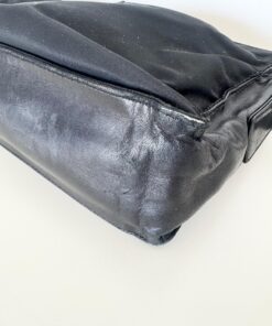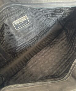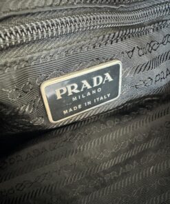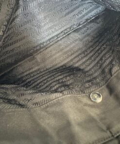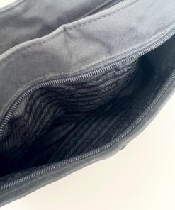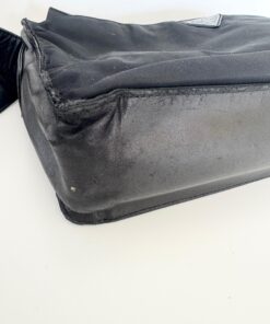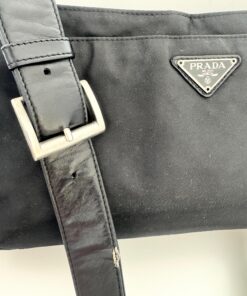 Borsa a spalla Prada in nylon nera, con tre comode tasche. Fondo e manico in pelle.