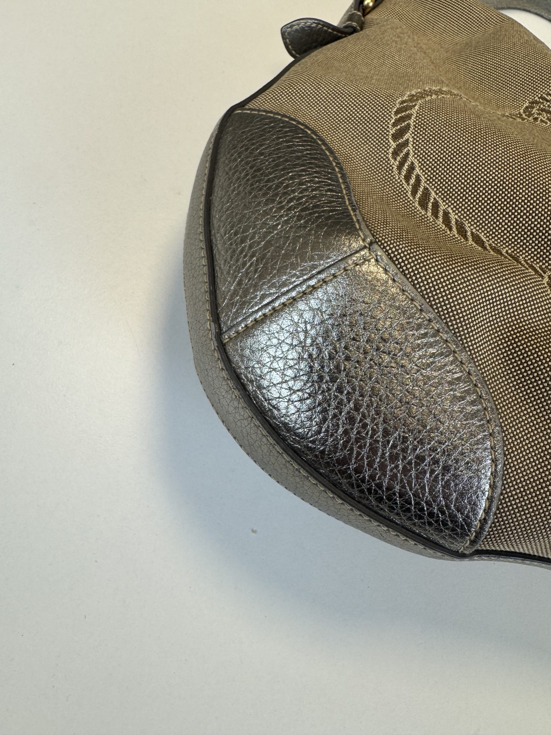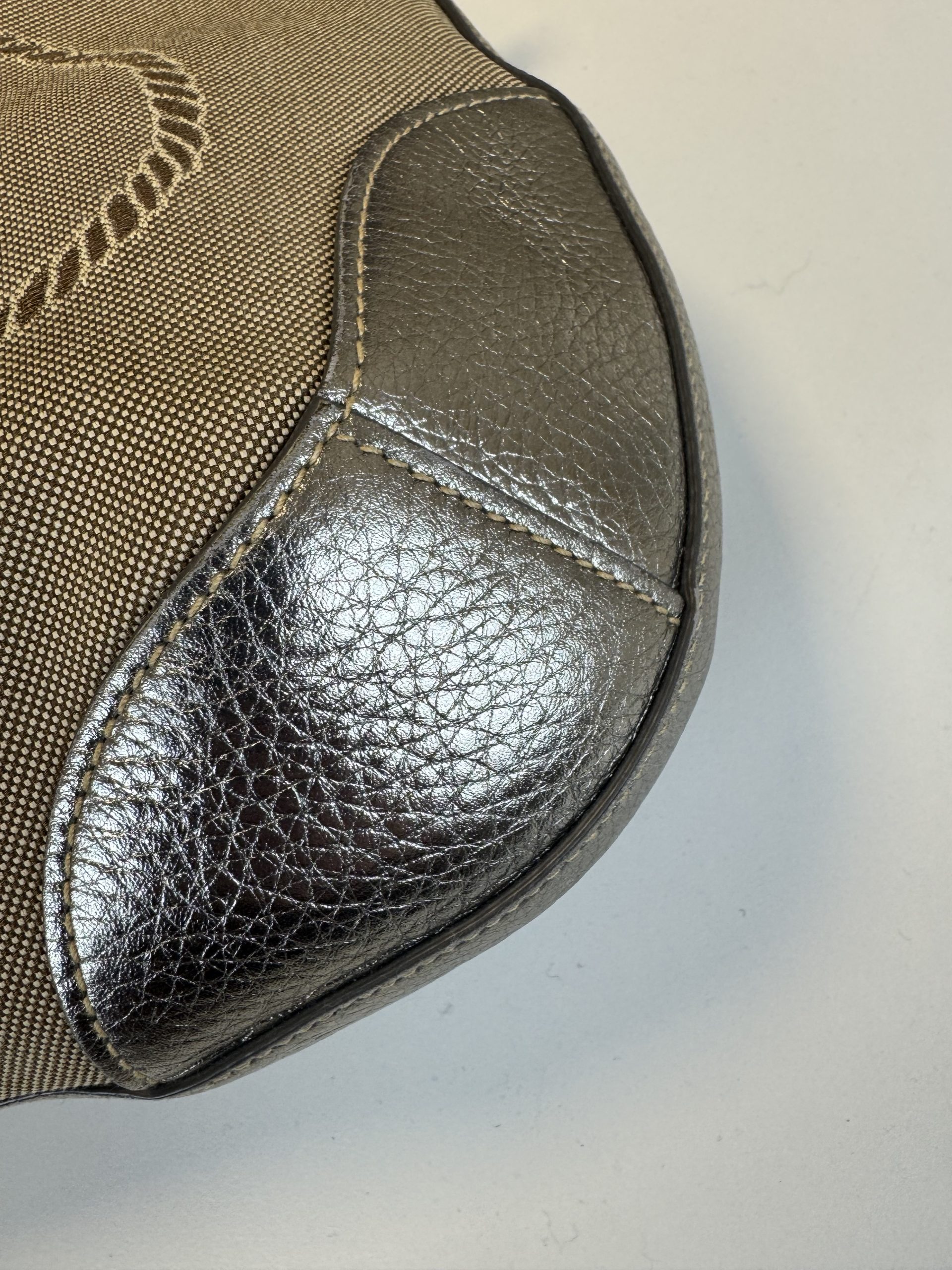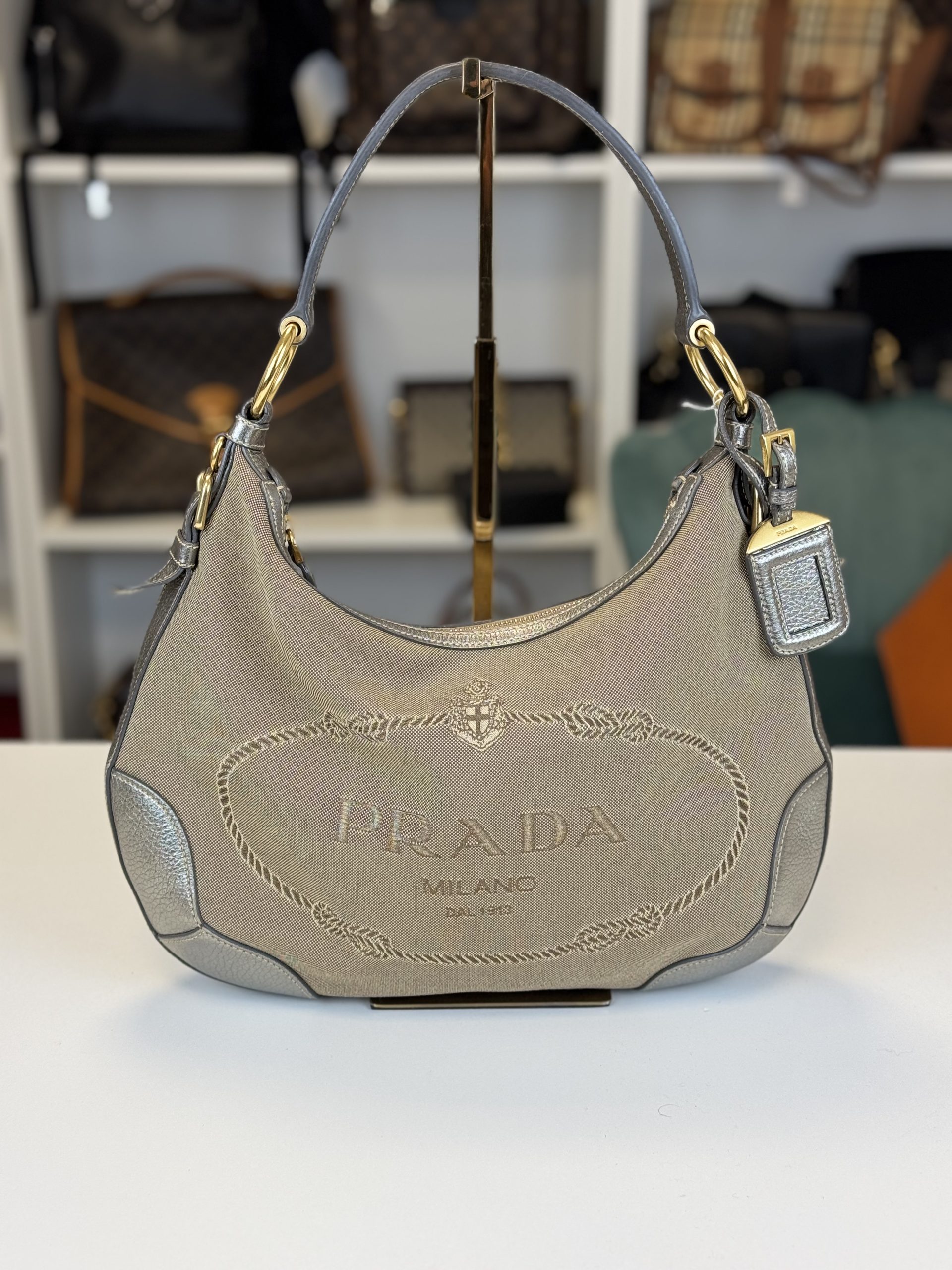 Bellissima borsa Prada Logo Jacquard Hobo Bag. È realizzata in tela jacquard color corda o beige, caratterizzata dal grande logo Prada Milano ricamato sul davanti. Arricchita con finiture in pelle metallizzata color argento.