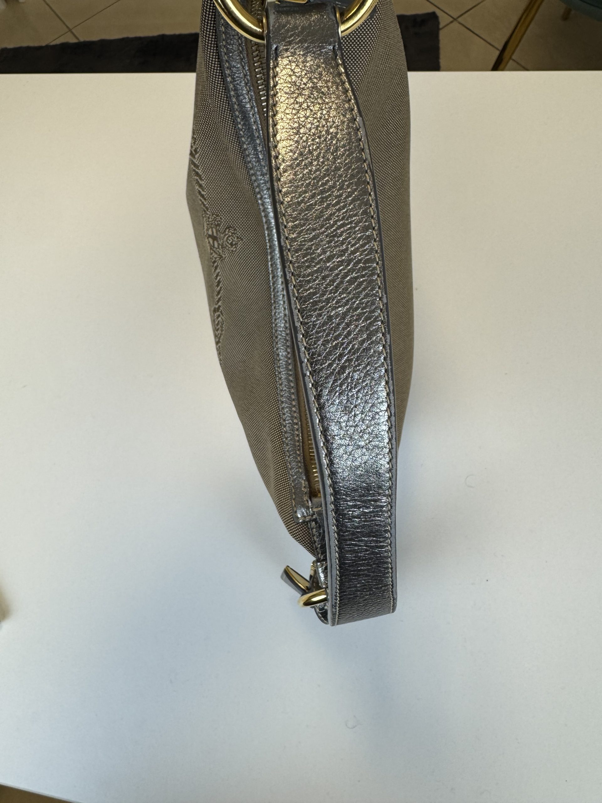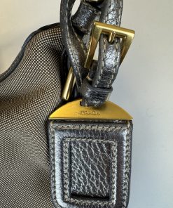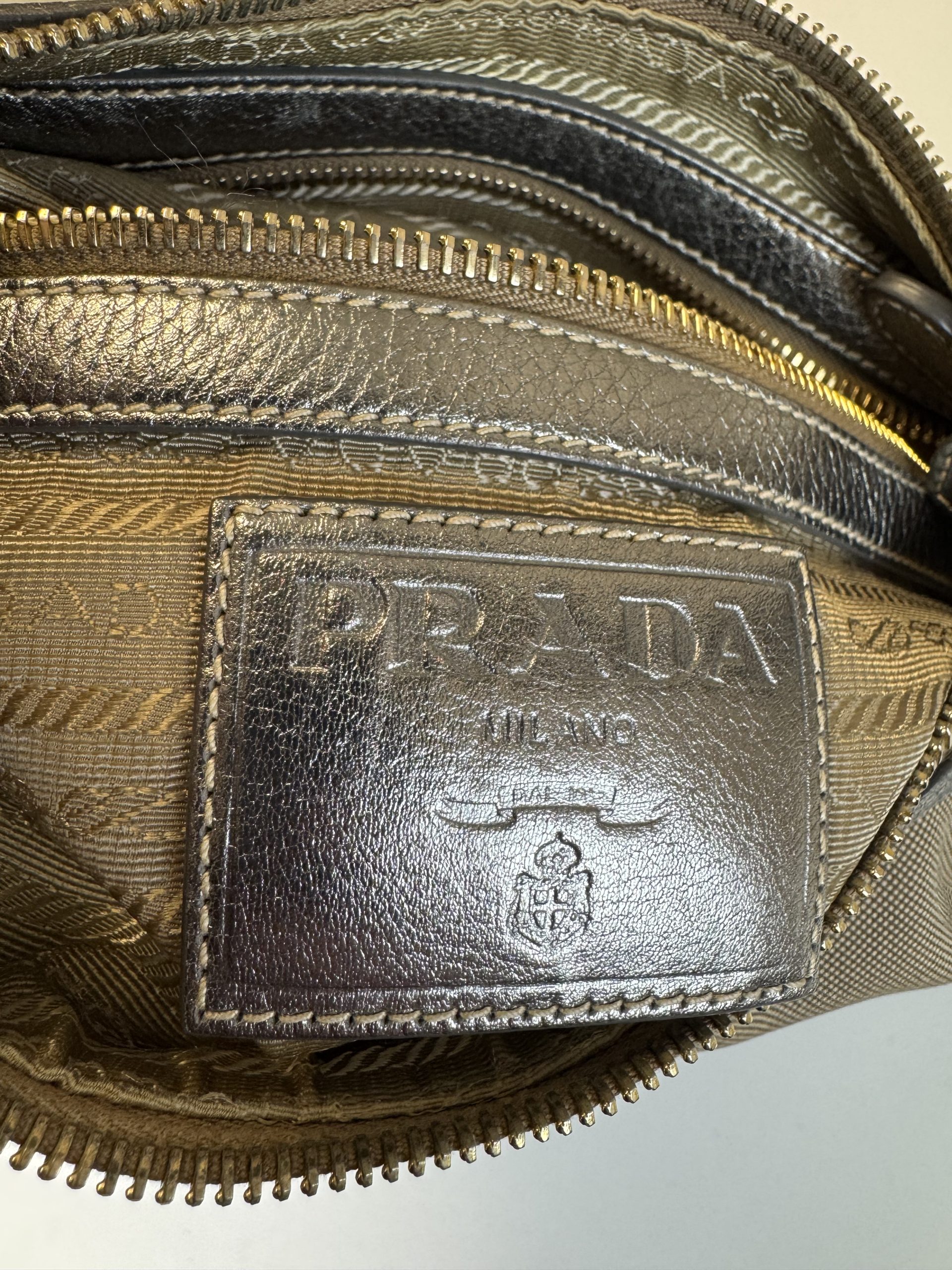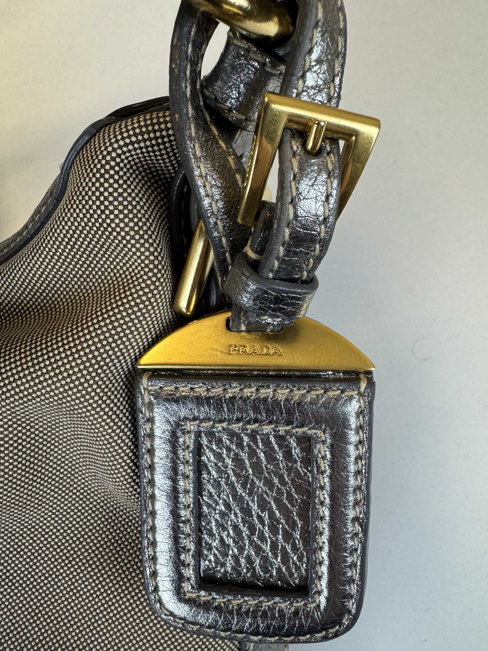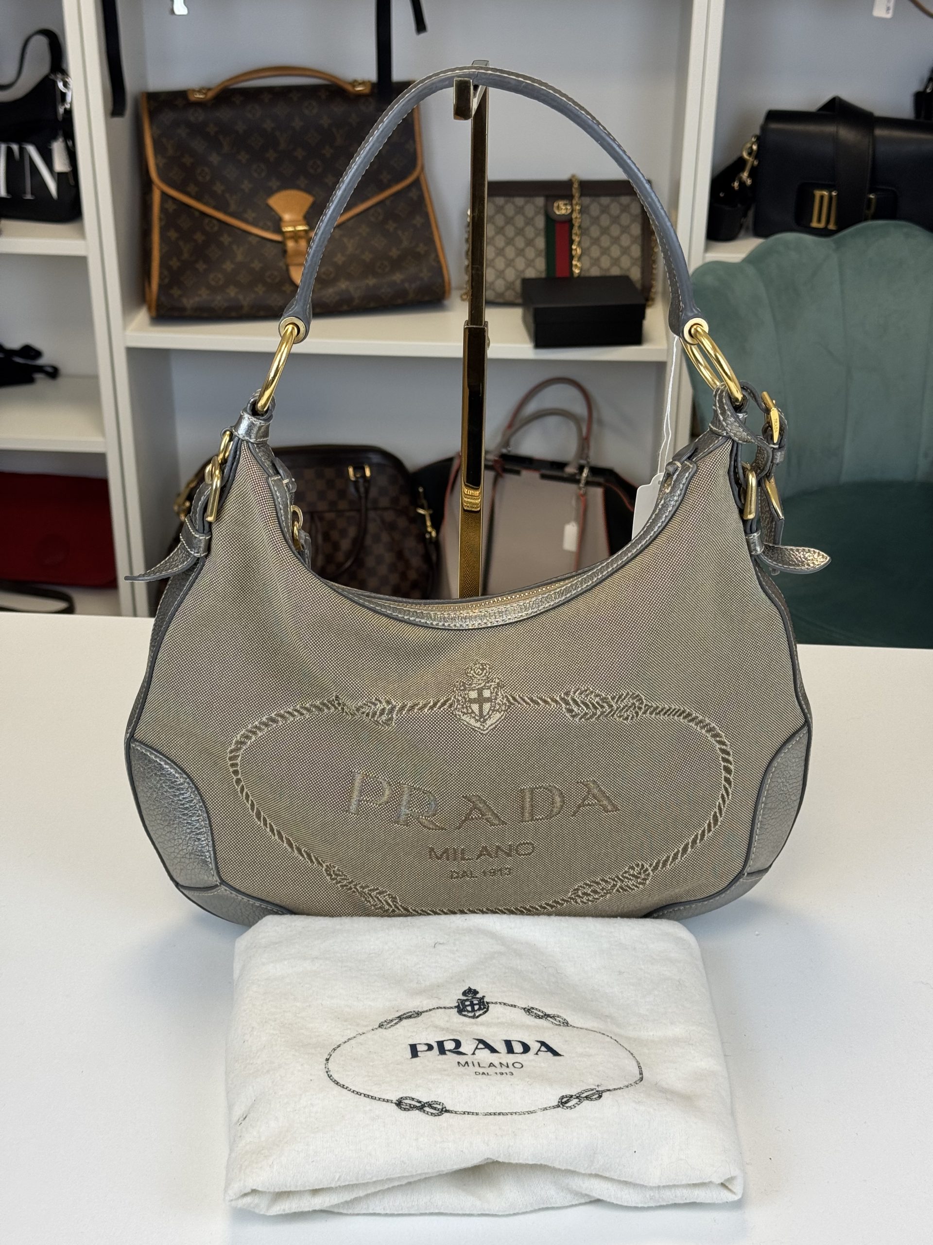 Borsa Prada in Tela Beige e Finiture in Pelle Argentate.