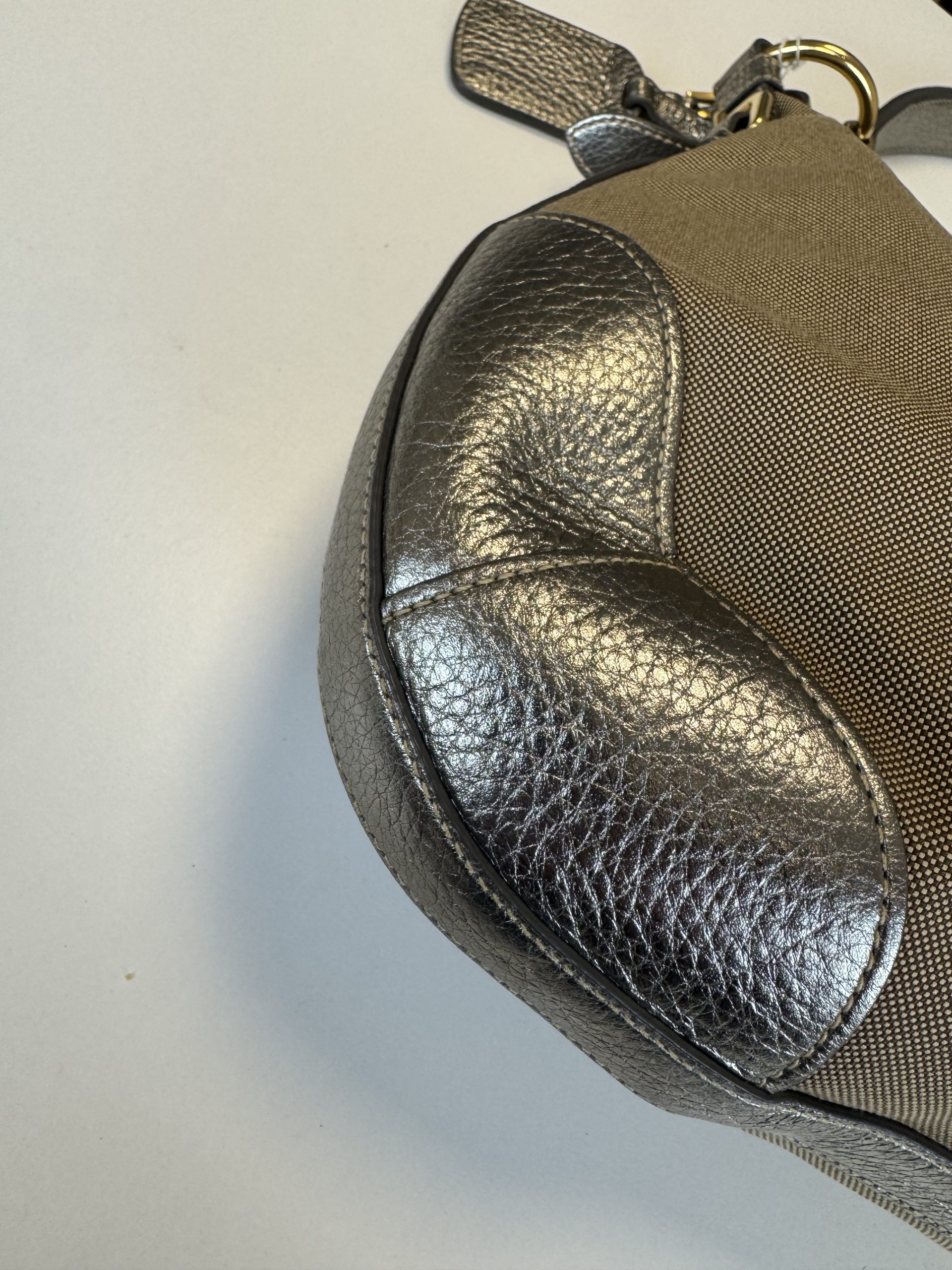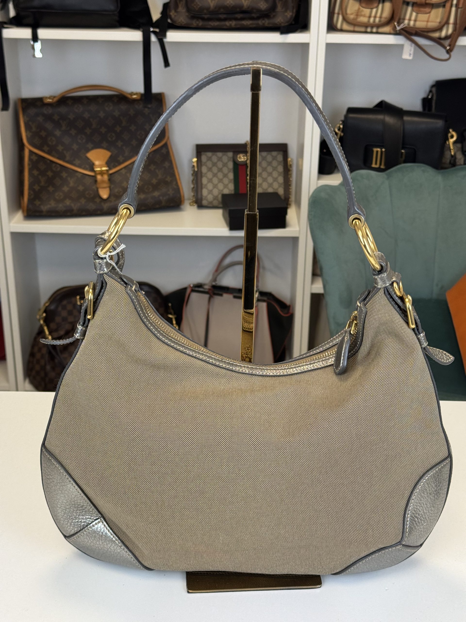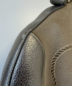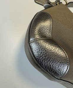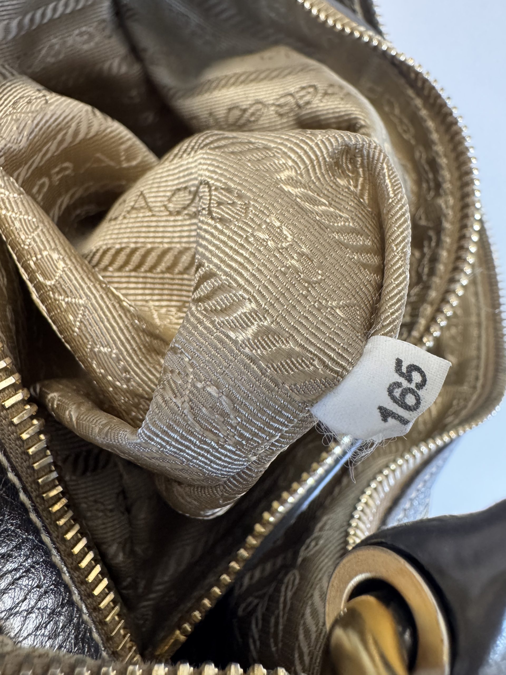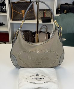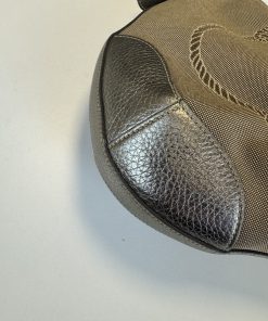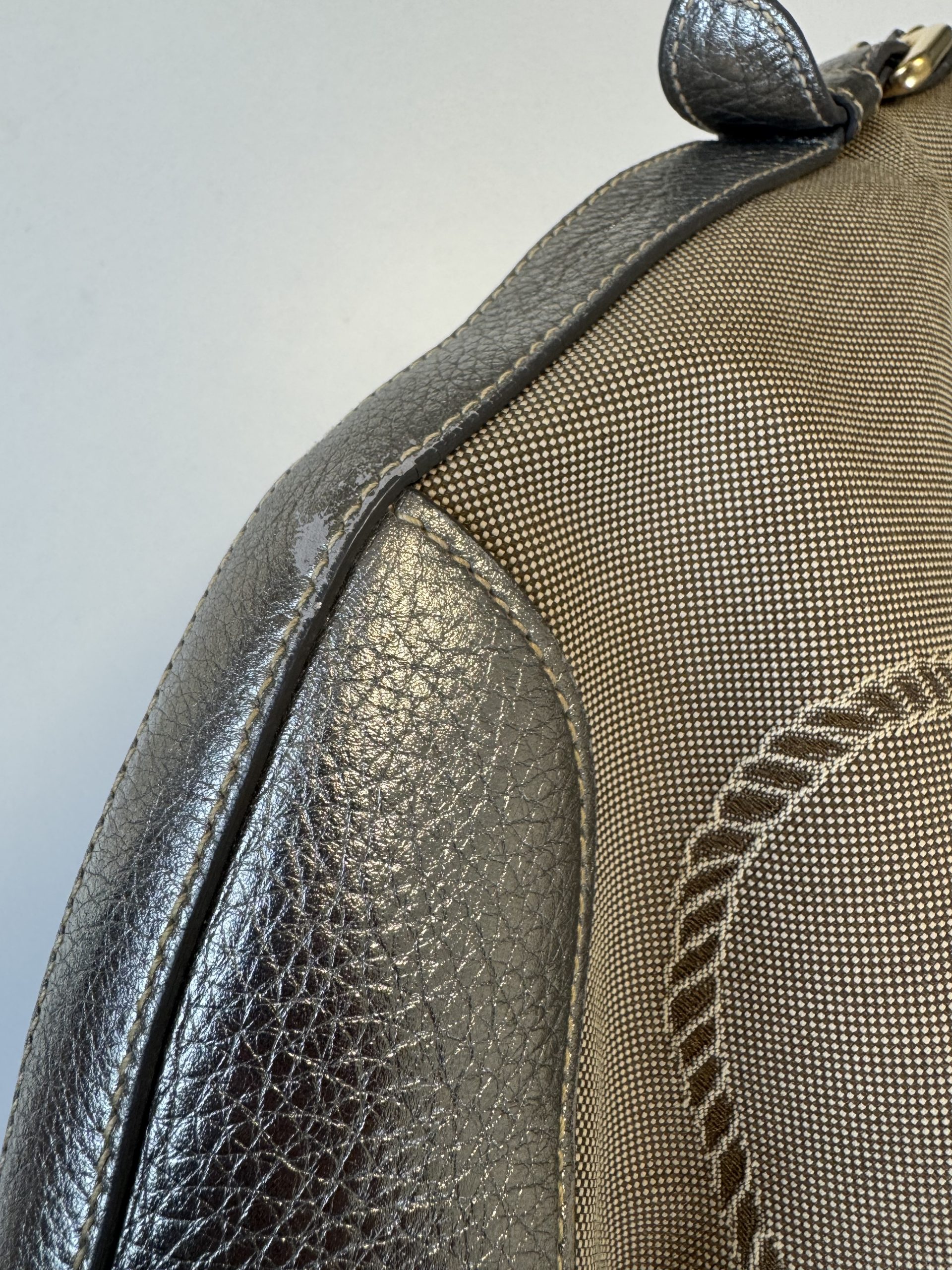 Borsa Prada in Tela Beige e Finiture in Pelle Argentate.