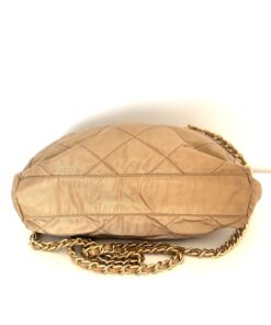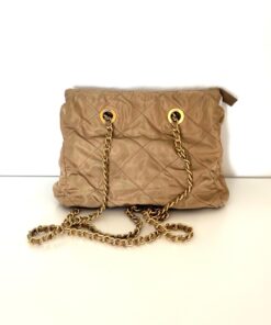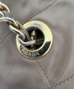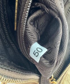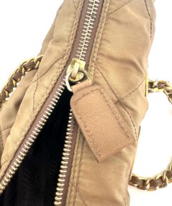 Borsa Prada in tessuto Nylon beige, con dettagli in metallo dorato e pelle.