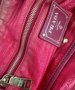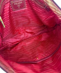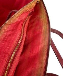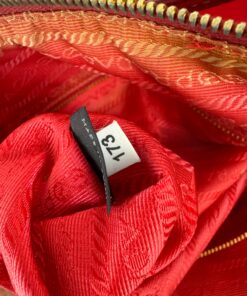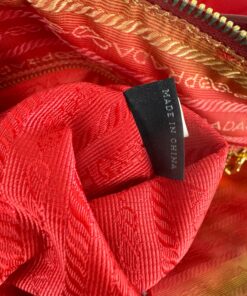 Internamente è in tessuto rosso firmato Prada ed è provvista di una tasca con cerniera e di una tasca piatta.