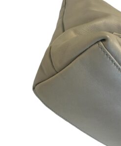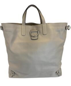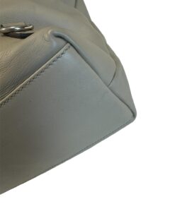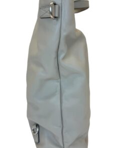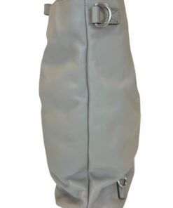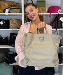 Realizzata in pelle color tortora ed hardware in metallo argentato.