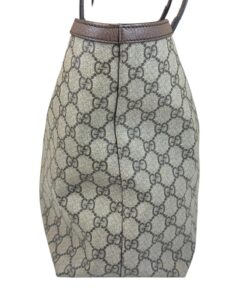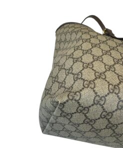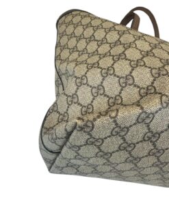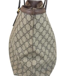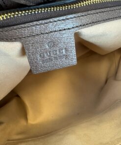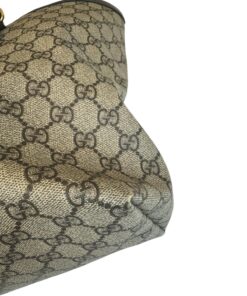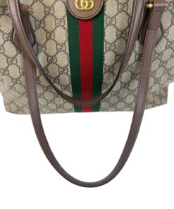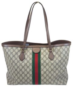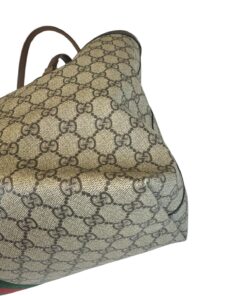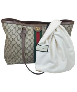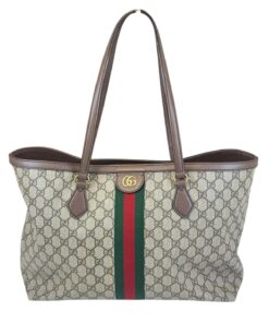 Bellissima Borsa Shopping Ophidia Misura Media GG Supreme Beige e Marrone, che racchiude quasi tutti i segni emblematici di Gucci: dal tessuto GG Supreme beige ed ebano, al Nastro Web verde e rosso di derivazione equestre, alla doppia GG color oro che decora il lato frontale.