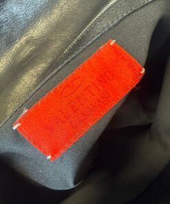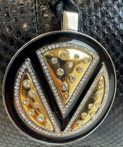 - Chiusura gioiello con V di Valentino Garavani, in metallo nero con dettagli dorati e zirconi bianchi
