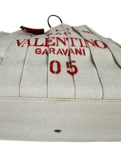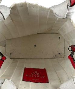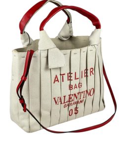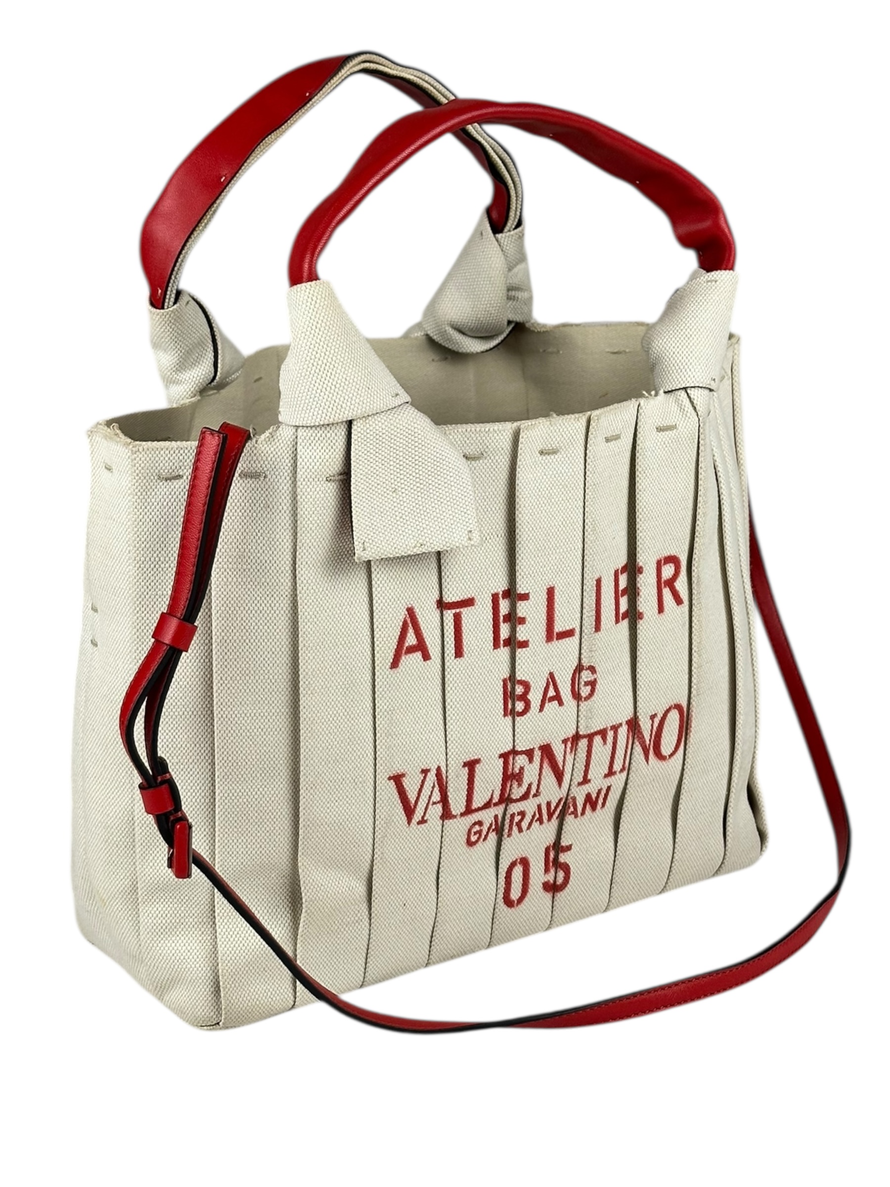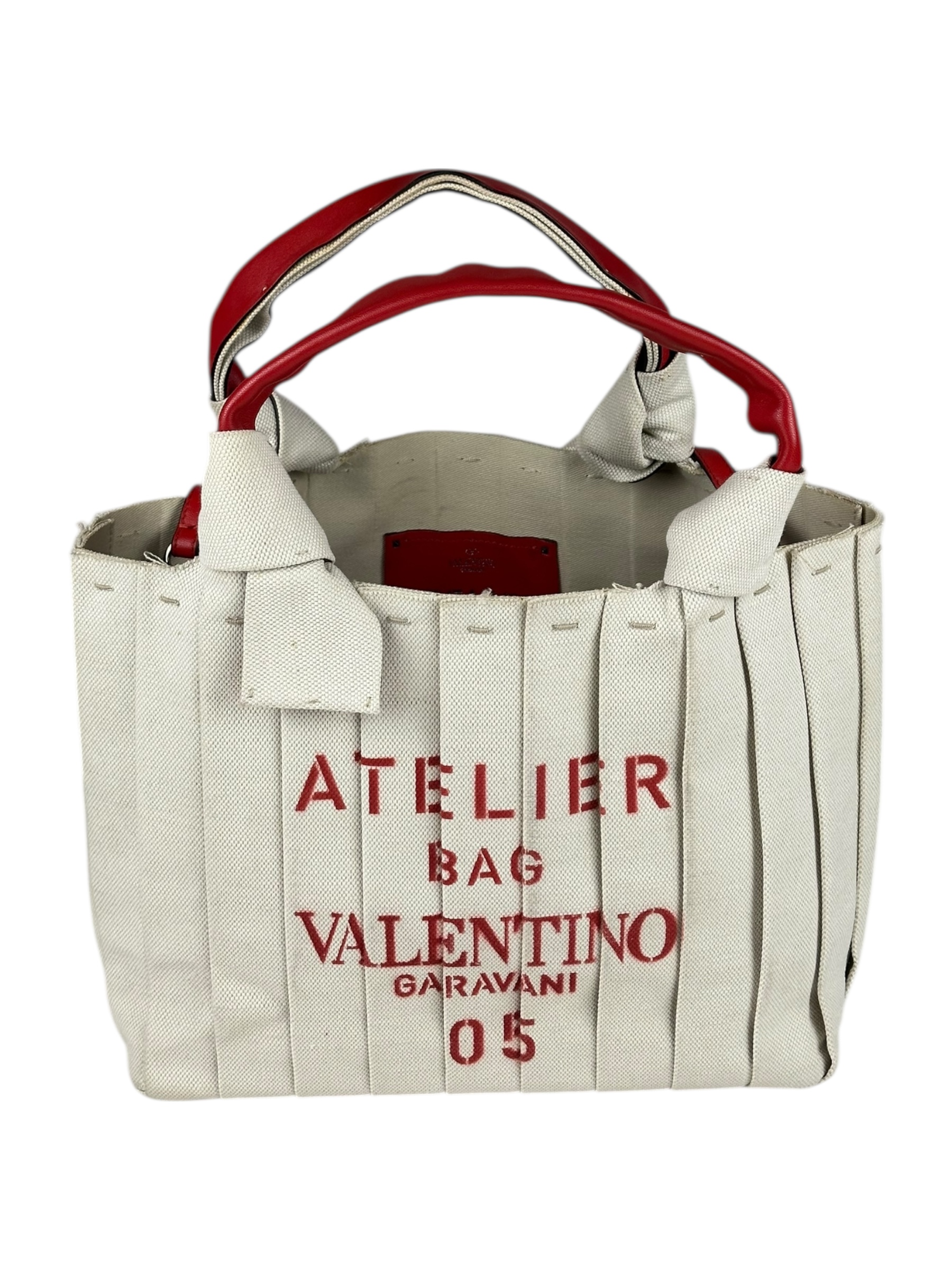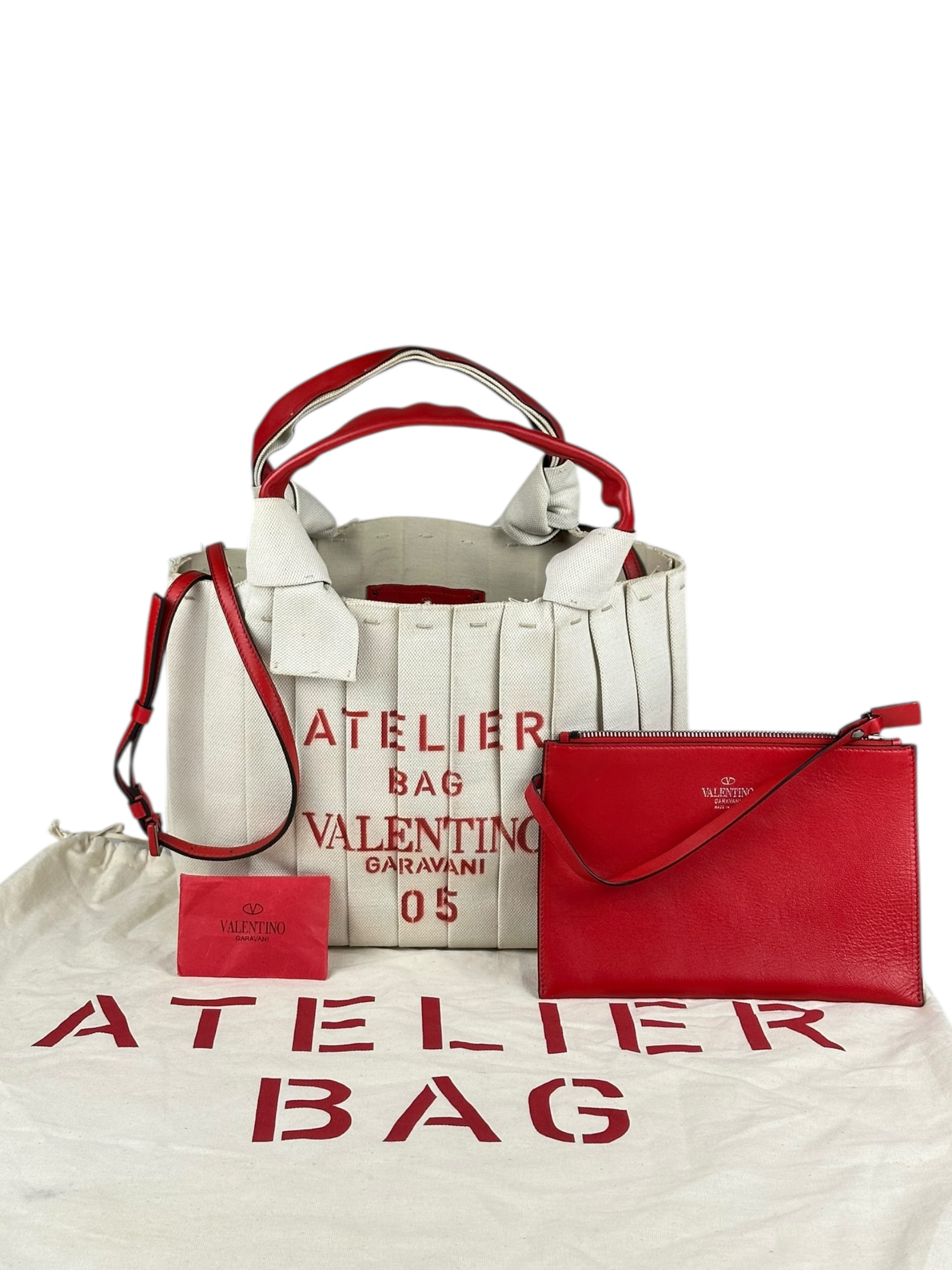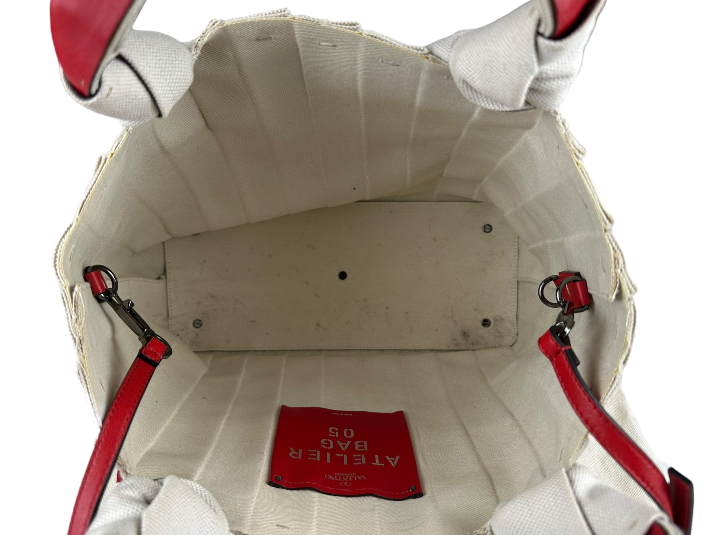 Borsa Valentino Garavani Tote Atelier Bag 05 in Tessuto Bianca e Rossa, accessoriata con pochette in morbida pelle rossa, utilizzabile anche da sola.