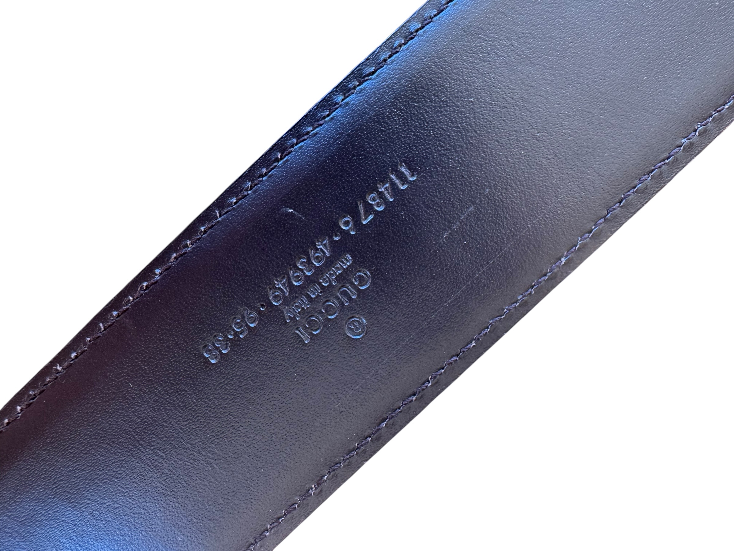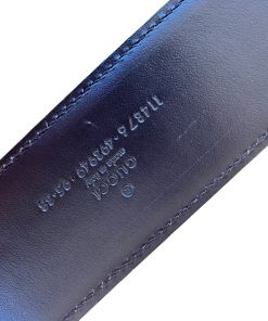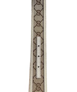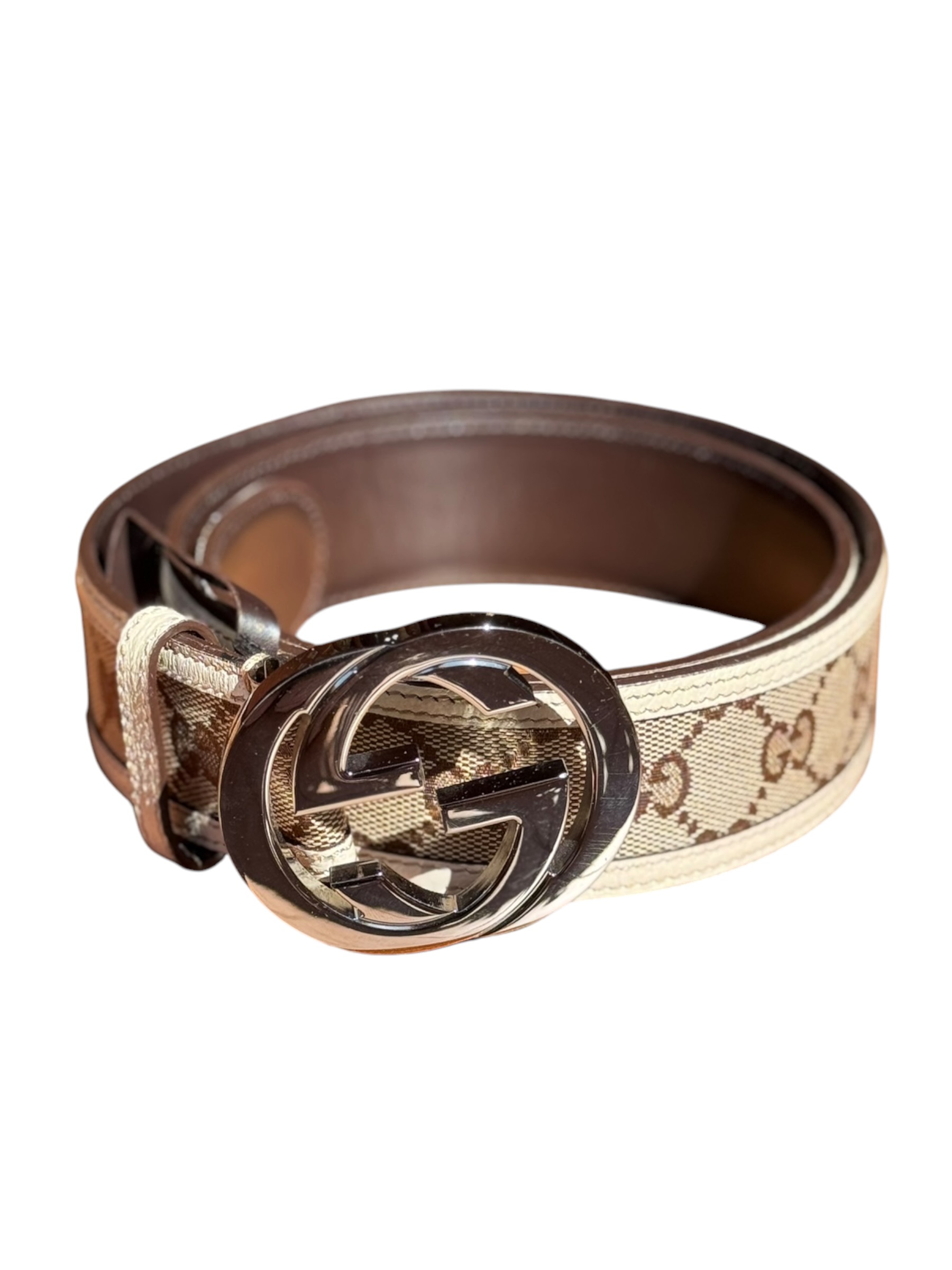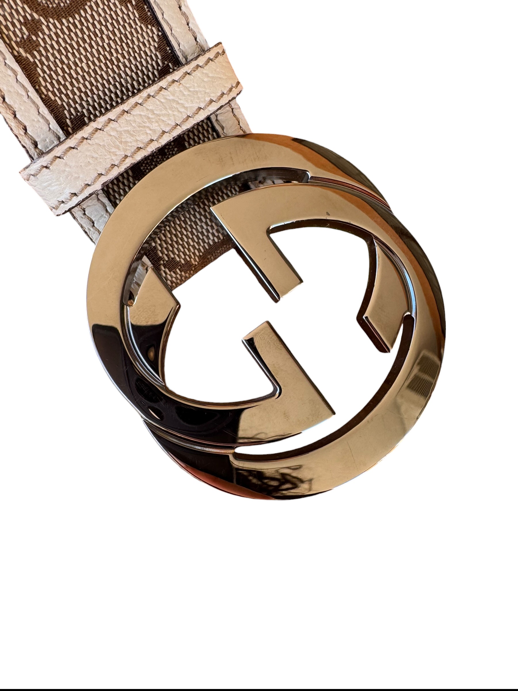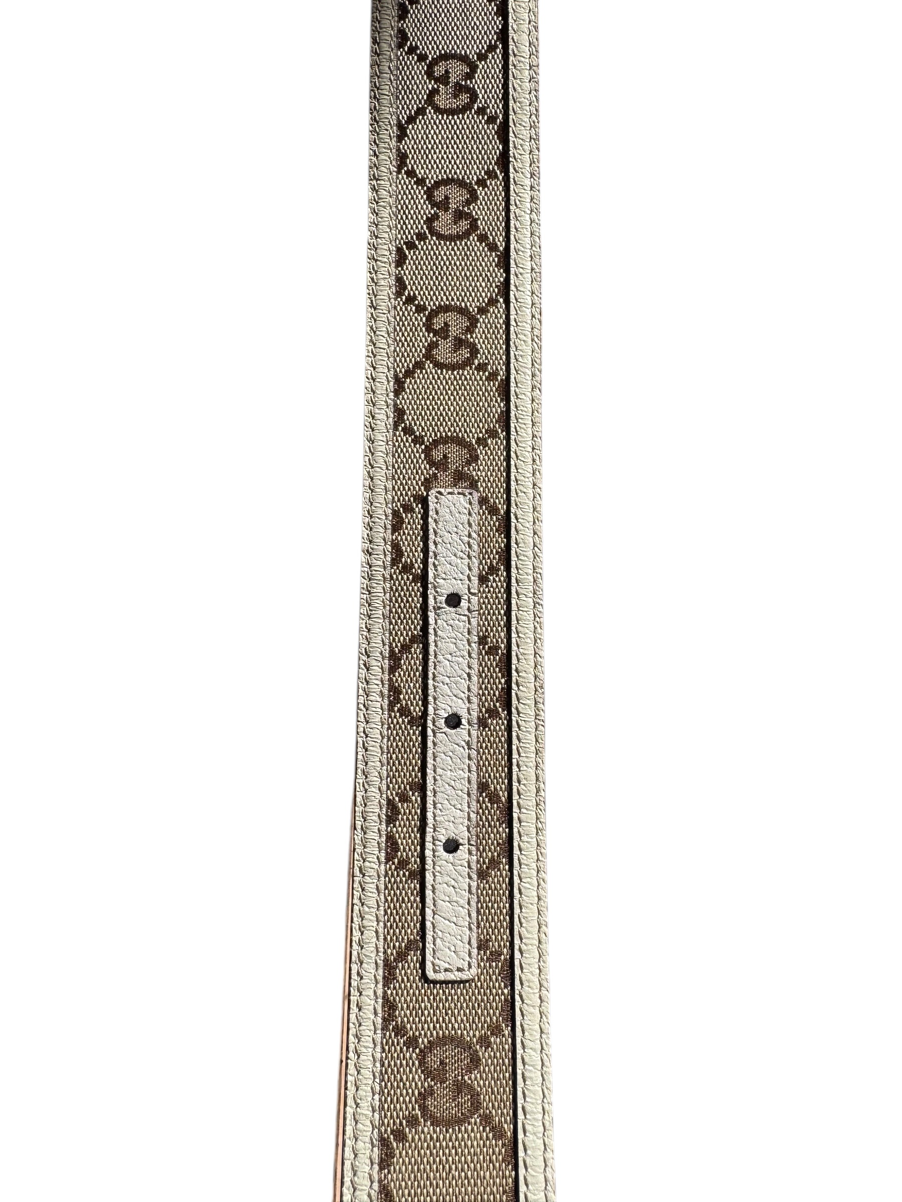 Cintura unisex caratterizzata dal nastro tela monogram beige ed ebano con profili in pelle color panna. Iconica fibbia con doppia G incastrata in metallo color argento.