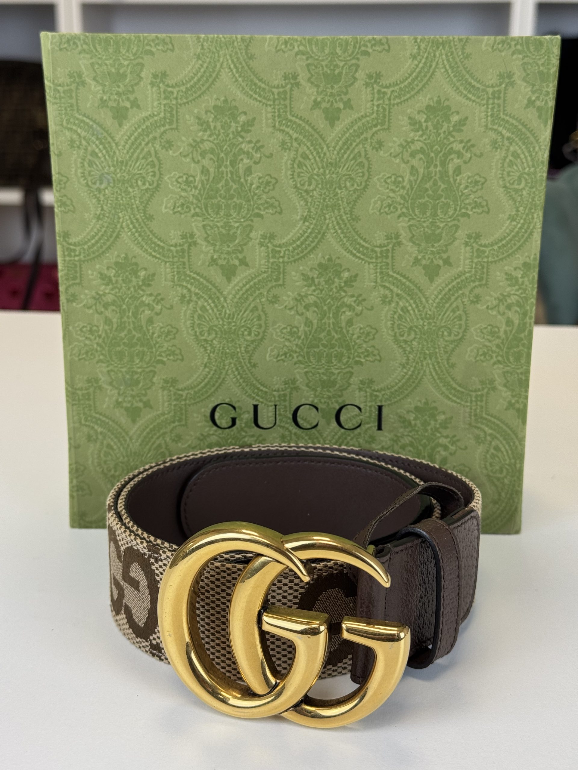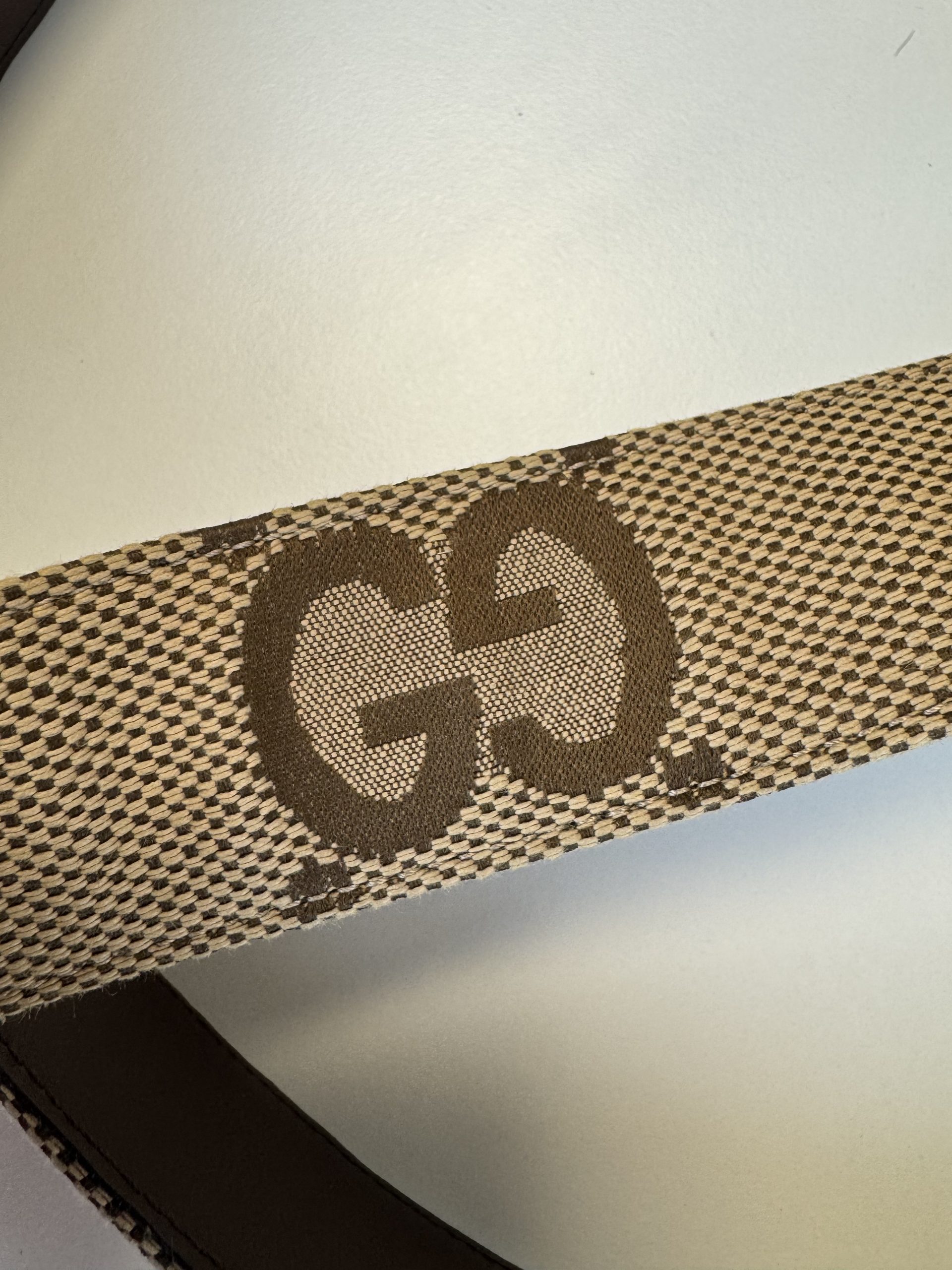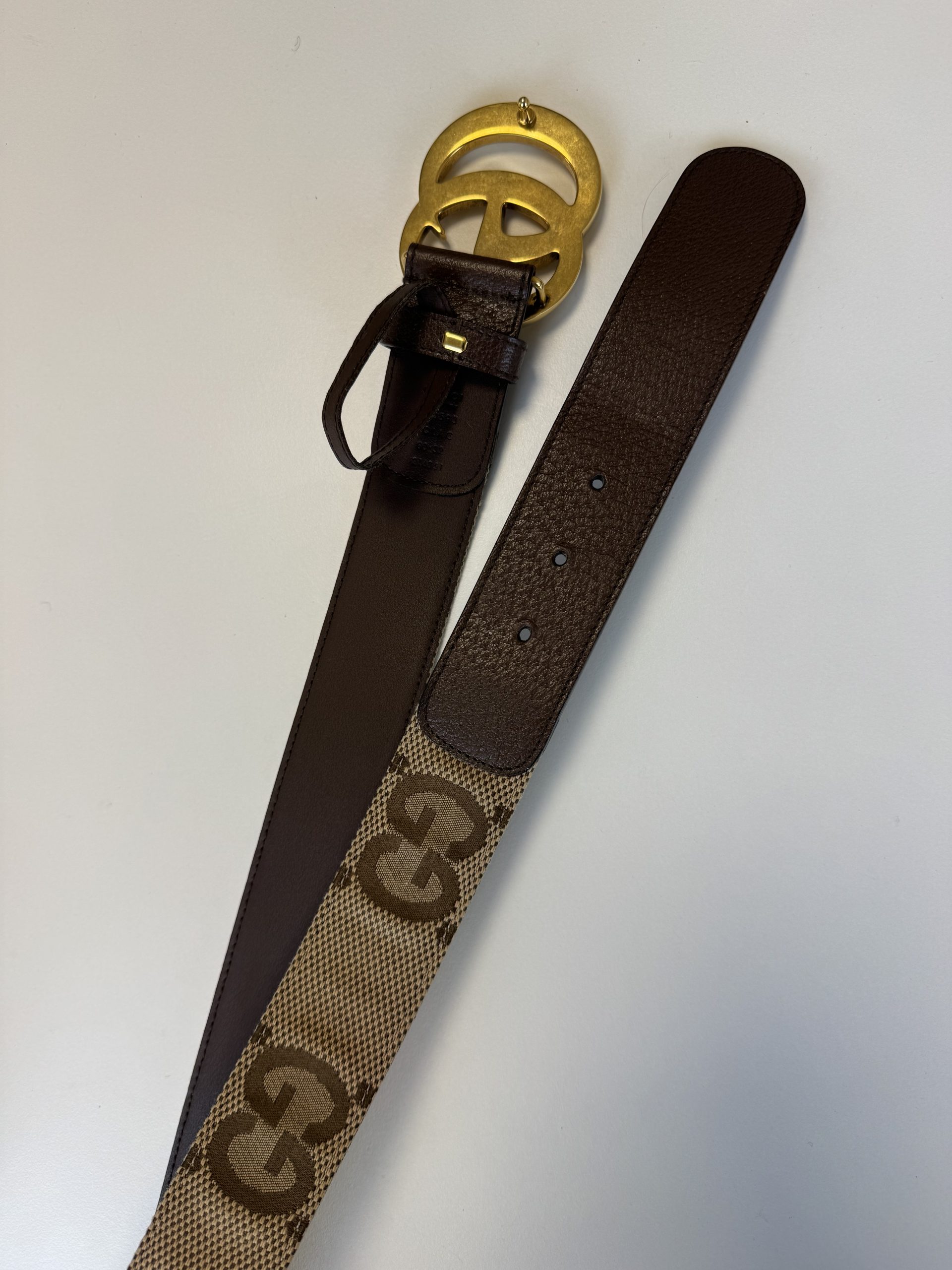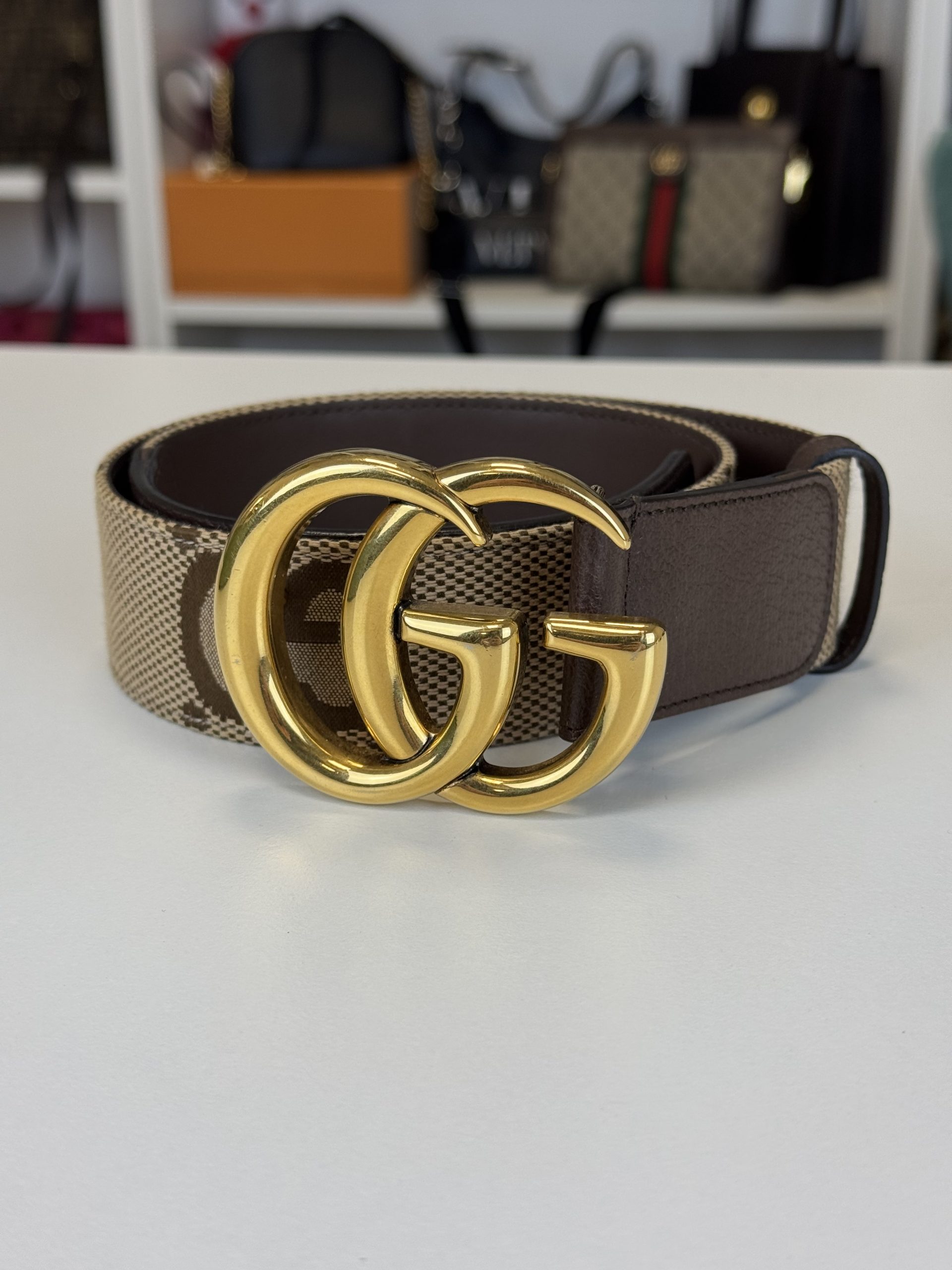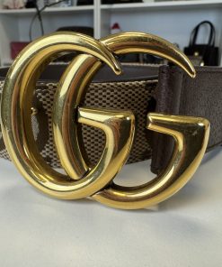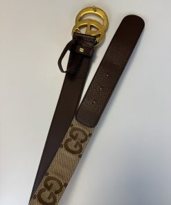Bellissima cintura in due colorazioni: beige e marrone. Trama in tessuto GG e rifiniture in pelle.