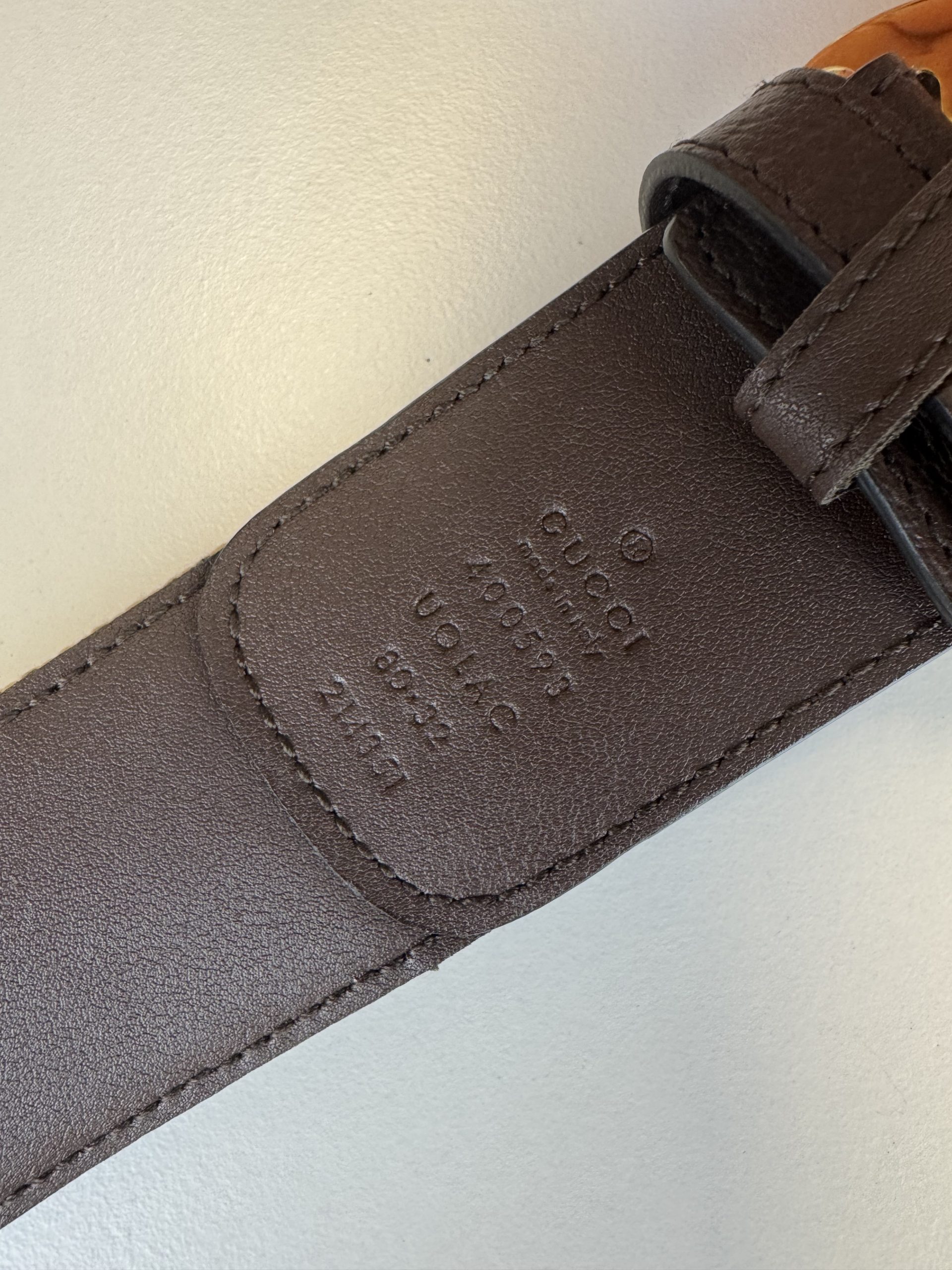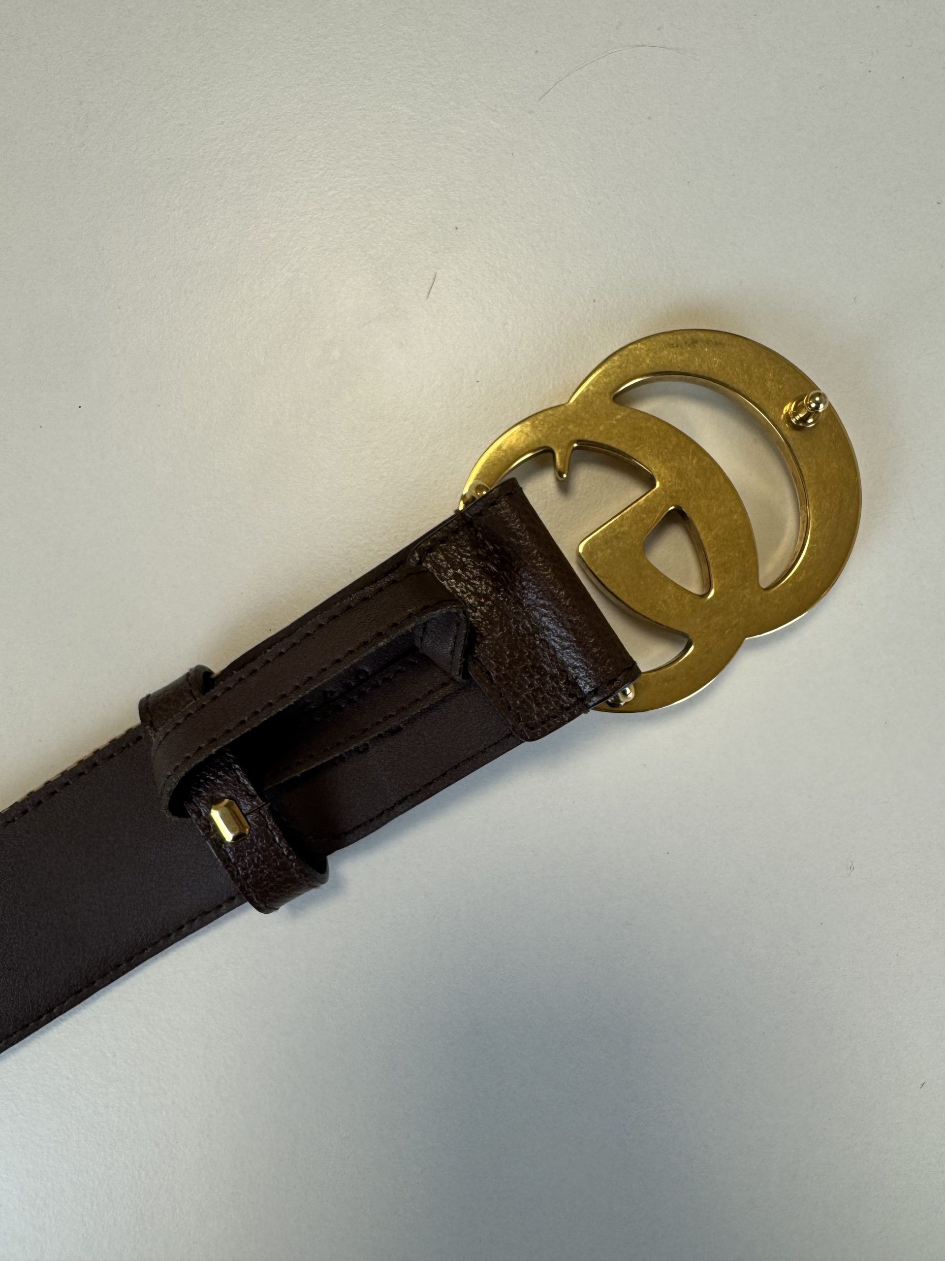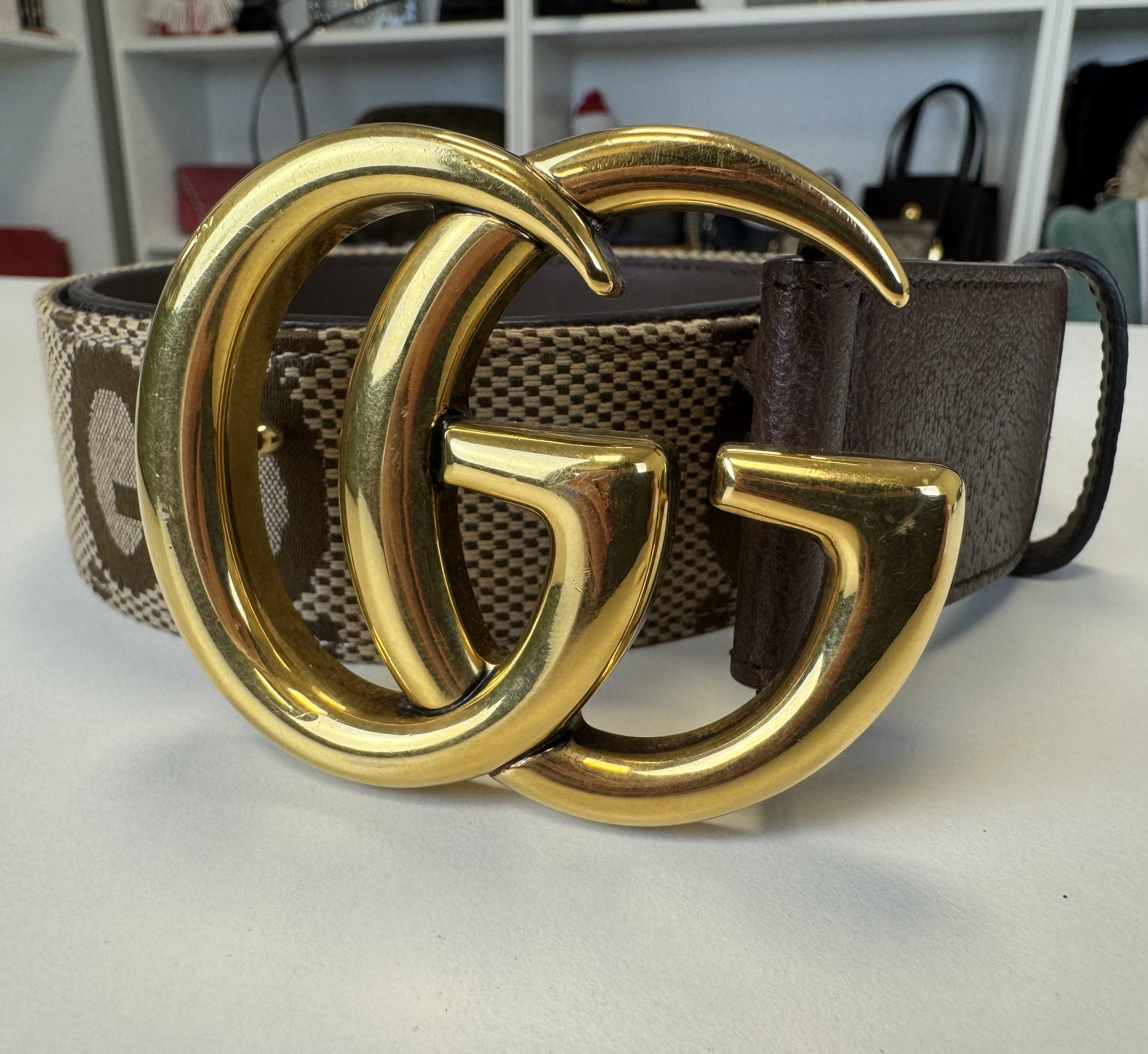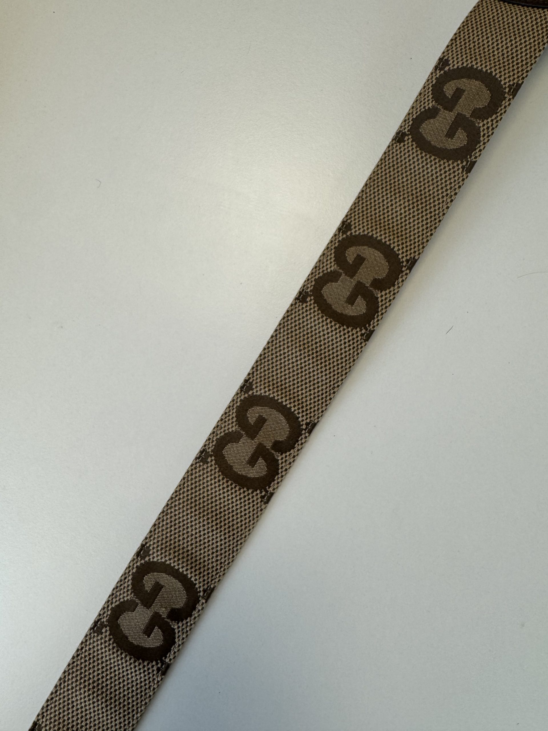 Bellissima cintura in due colorazioni: beige e marrone. Trama in tessuto GG e rifiniture in pelle.