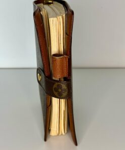 È organizzata con un raccoglitore a sei anelli in metallo dorato, porta penna in pelle, sei fessure per biglietti e carte di credito e due scomparti interni.