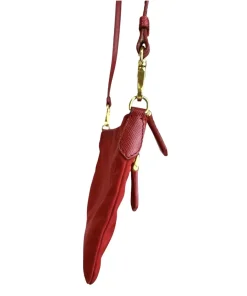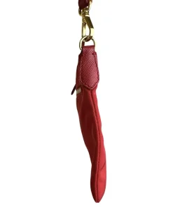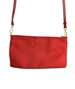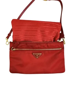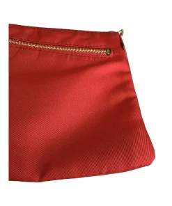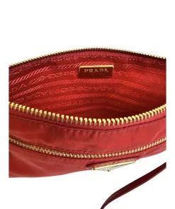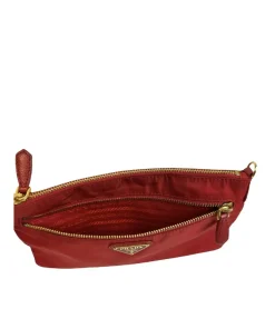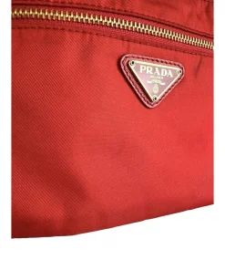 Pochette Prada in Nylon Rosso, indossabile a spalla tramite la tracolla in pelle removibile, oppure utilizzabile a mano.