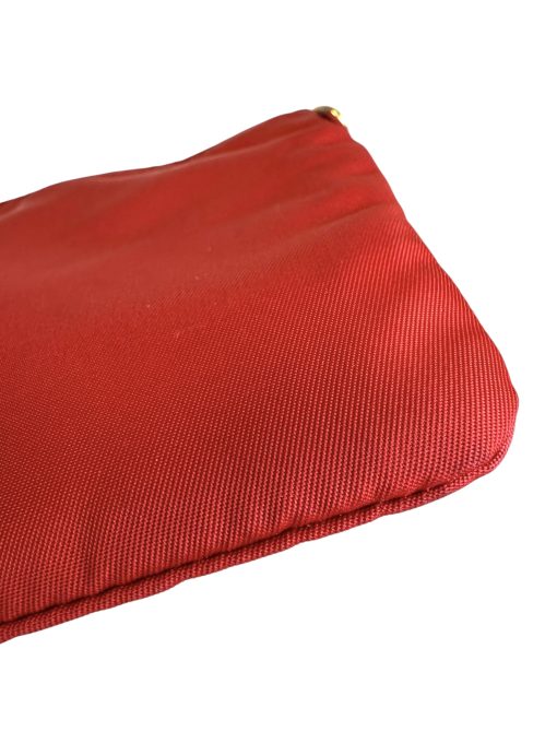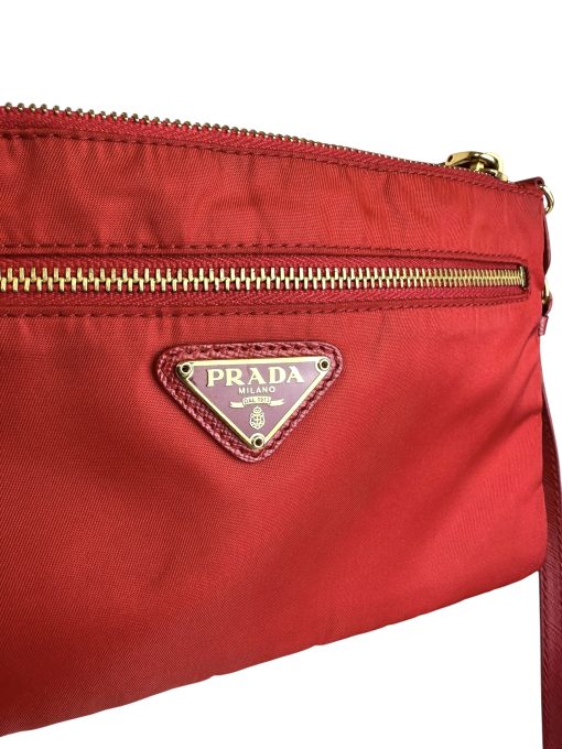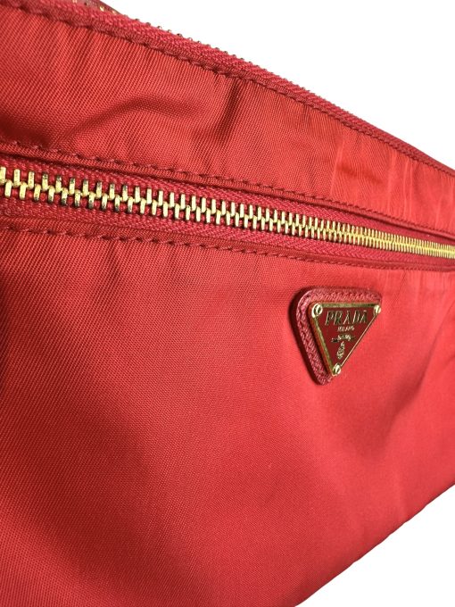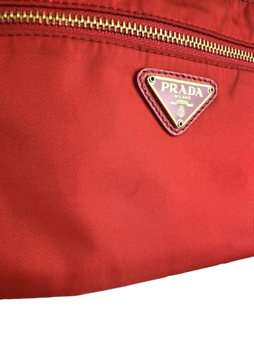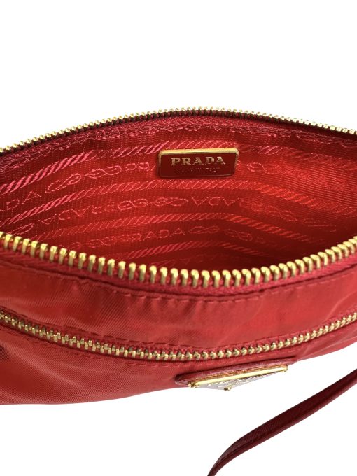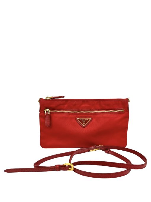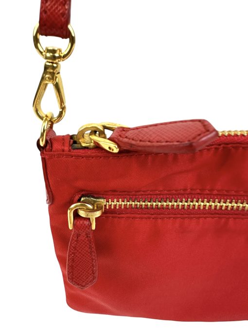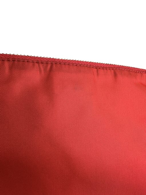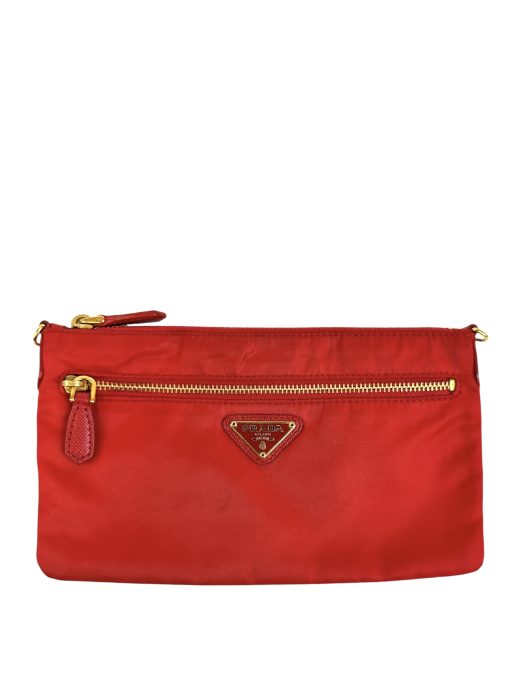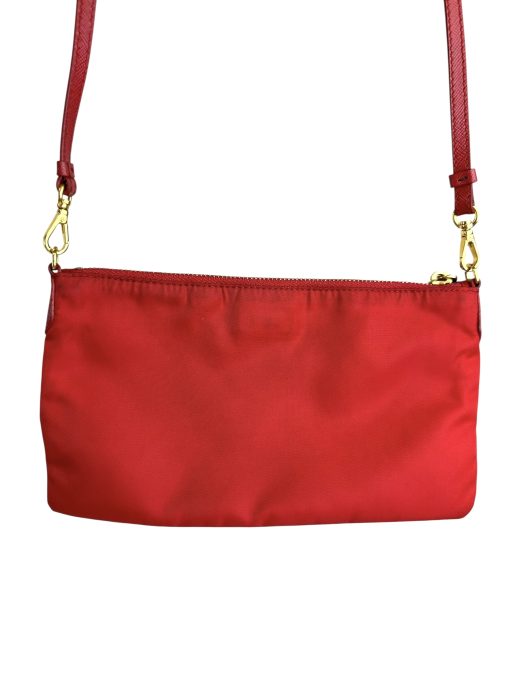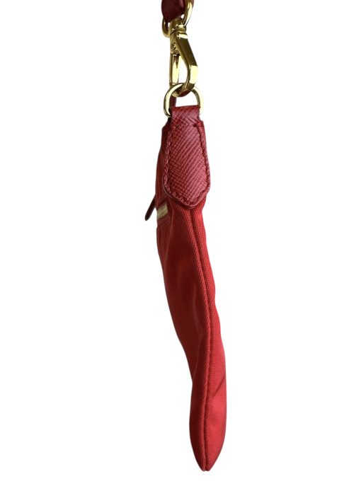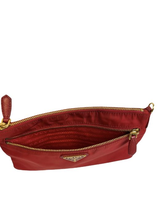 Pochette Prada in Nylon Rosso, indossabile a spalla tramite la tracolla in pelle removibile, oppure utilizzabile a mano.