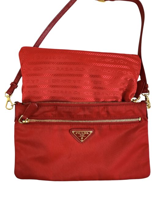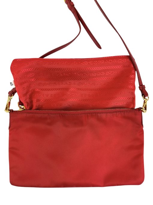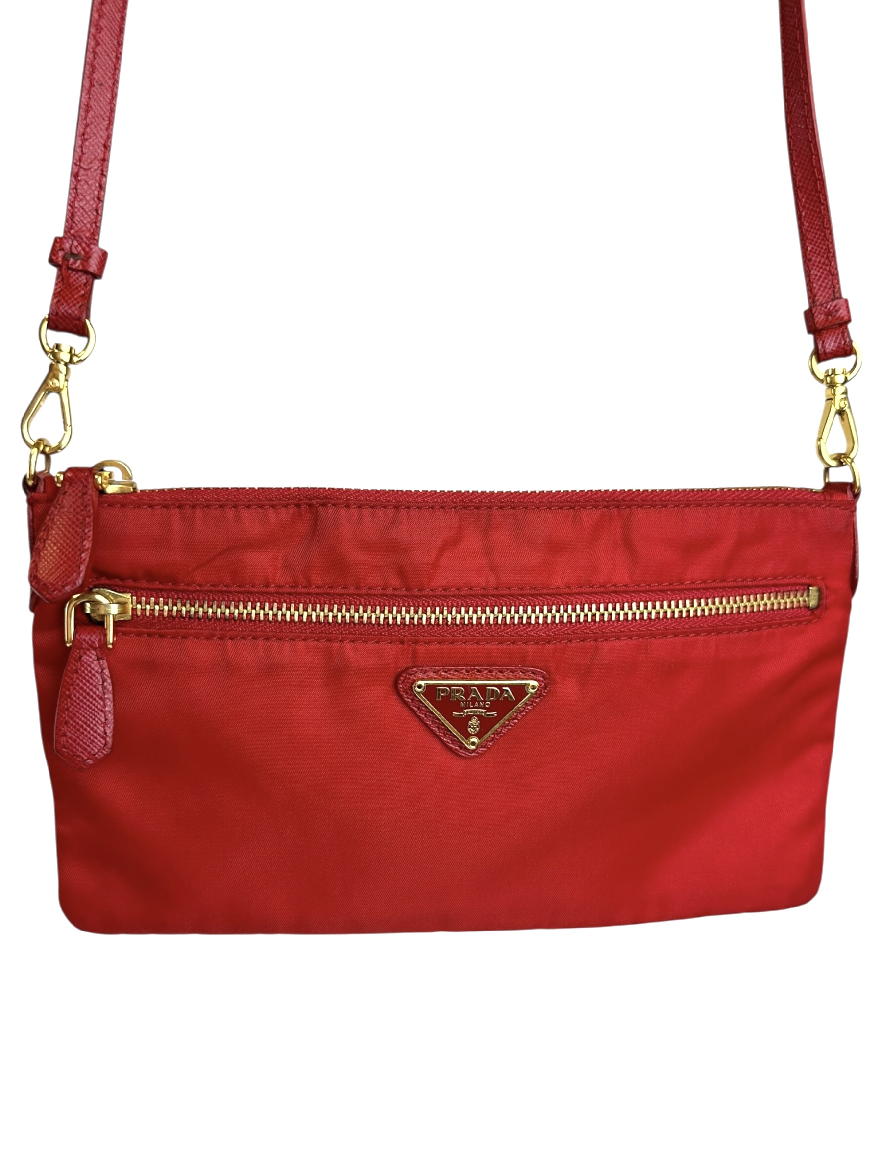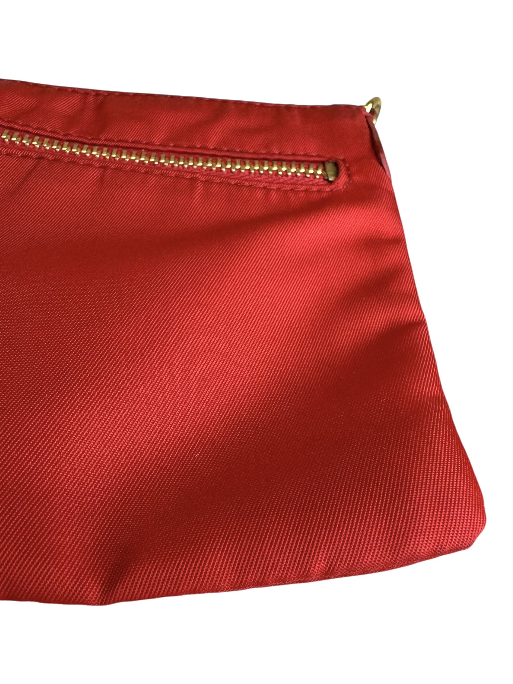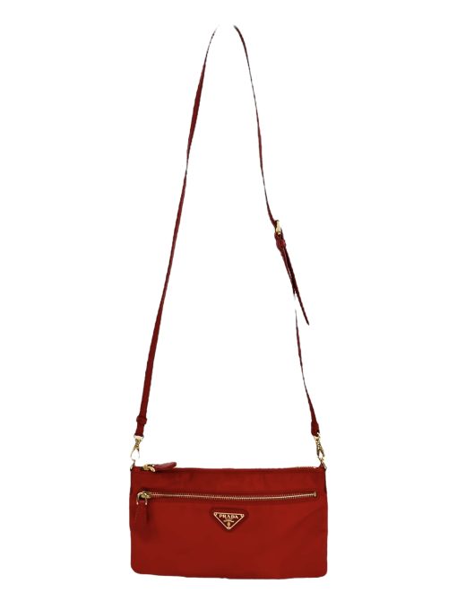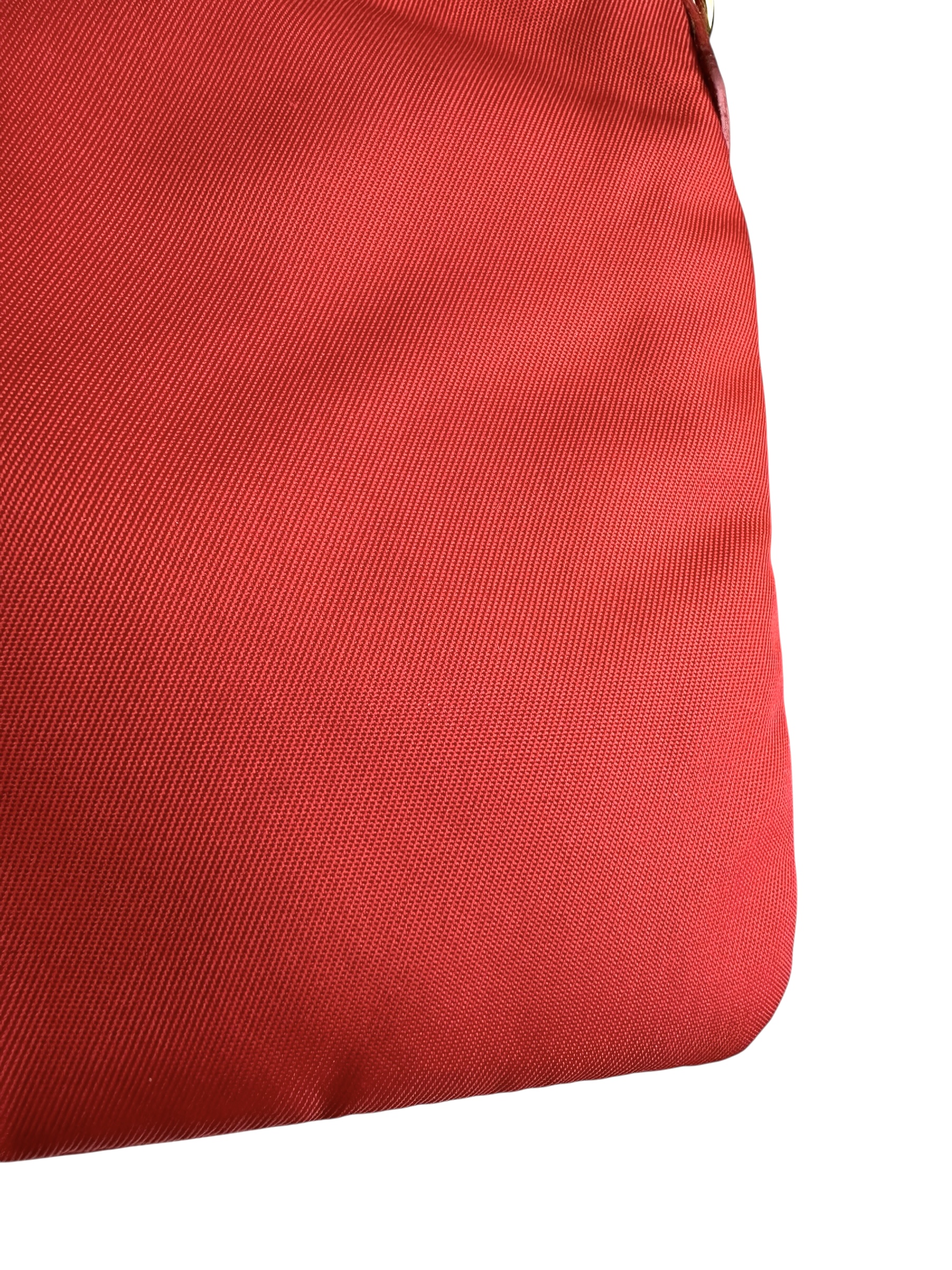 Pochette Prada in Nylon Rosso, indossabile a spalla tramite la tracolla in pelle removibile, oppure utilizzabile a mano.