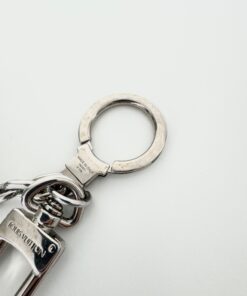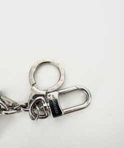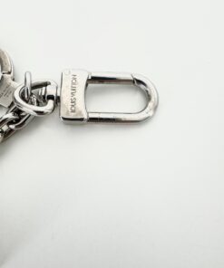 Le iconiche iniziali LV sono collegate, tramite catenella, all’anello firmato Louis Vuitton (e sui cui è inciso il numero di serie del prodotto) e al moschettone, anch’esso firmato.