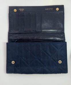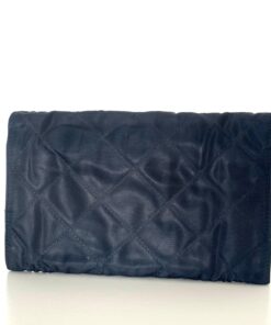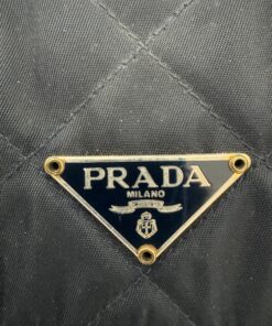 Tessuto in nylon trapuntato, chiusura con due bottoni a pressione e logo triangolo Prada in metallo smaltato, applicato sulla patta frontale.