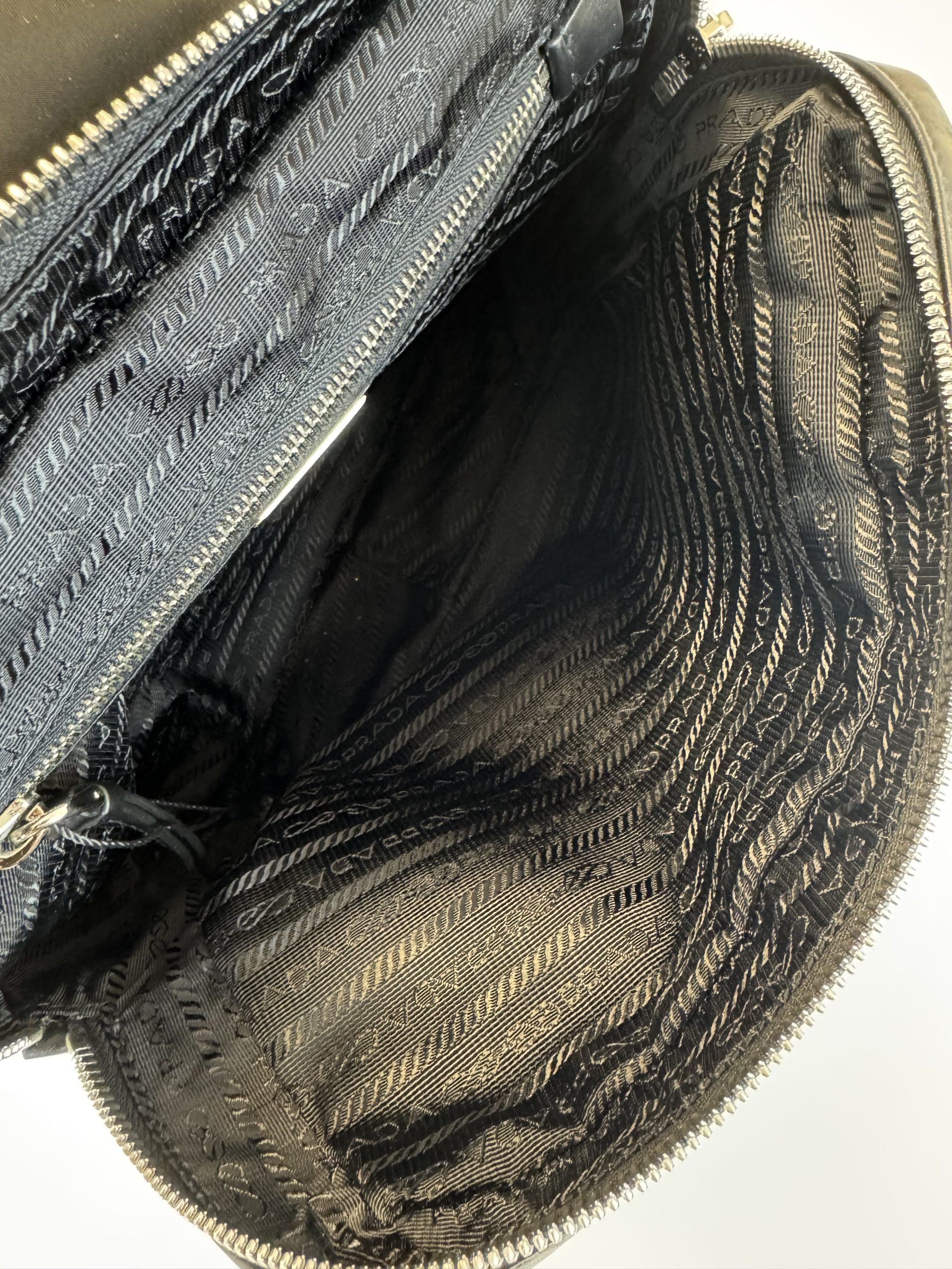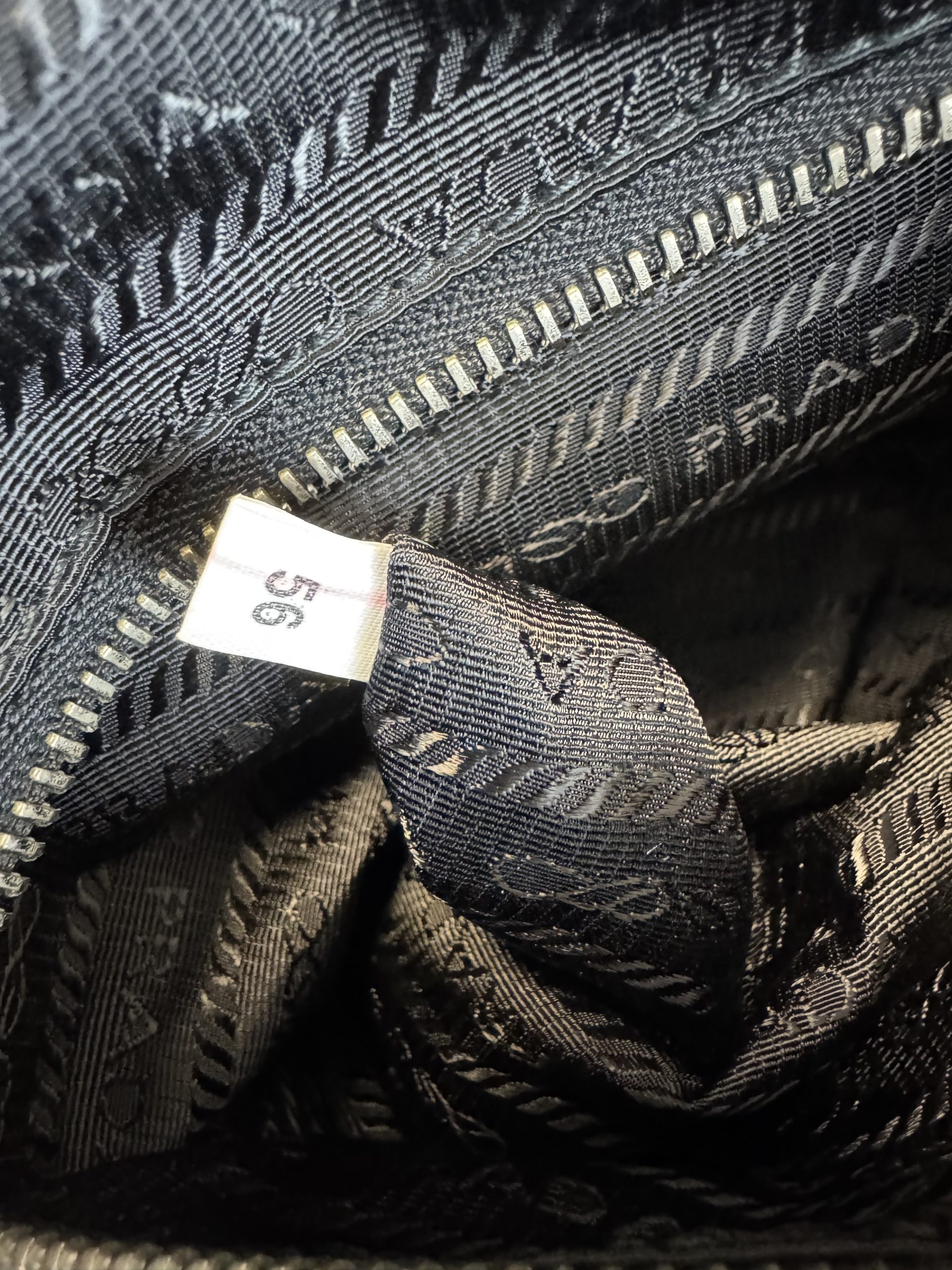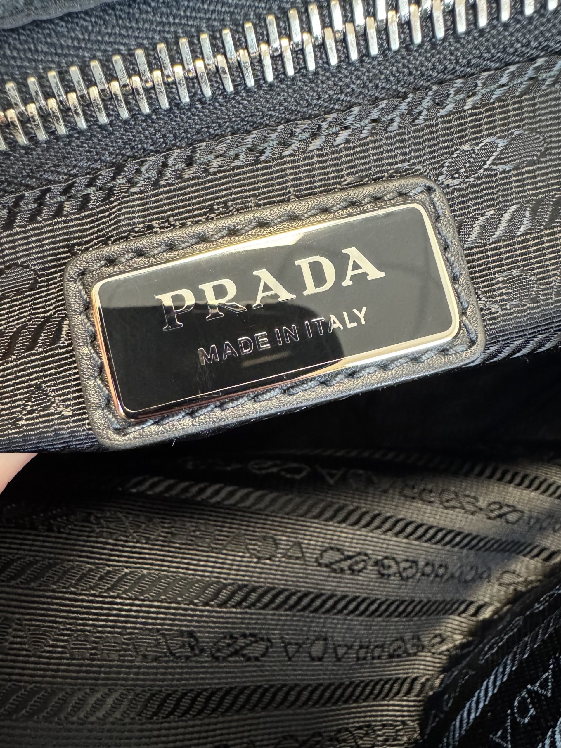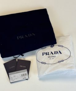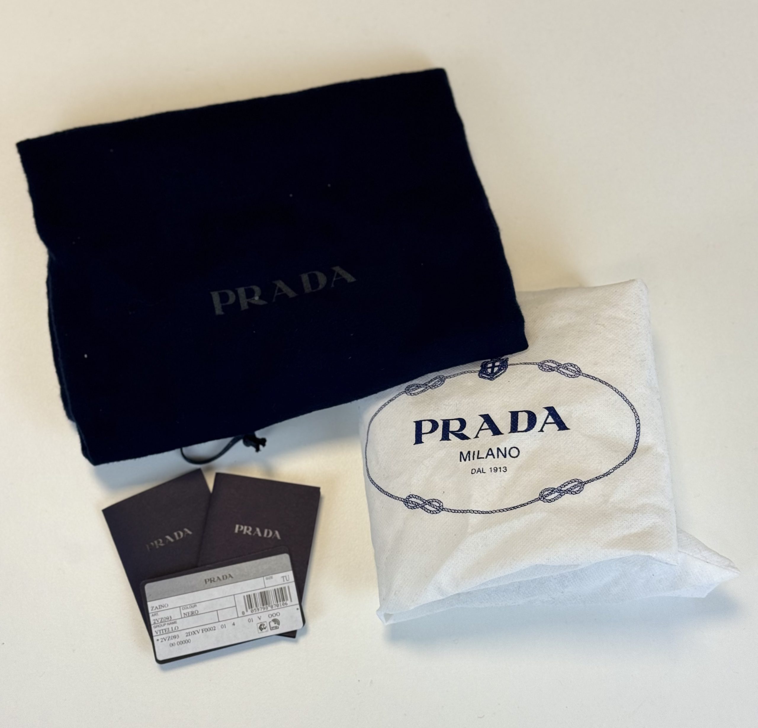 due dustbags, cartellini Prada, certificazione di autenticità Entrupy inclusa